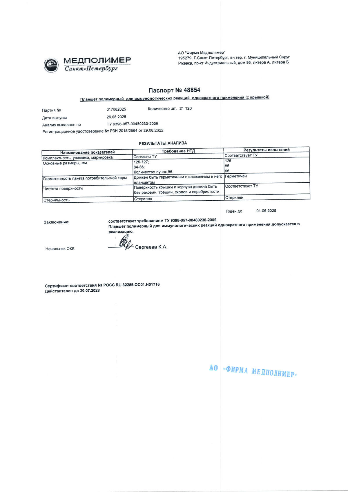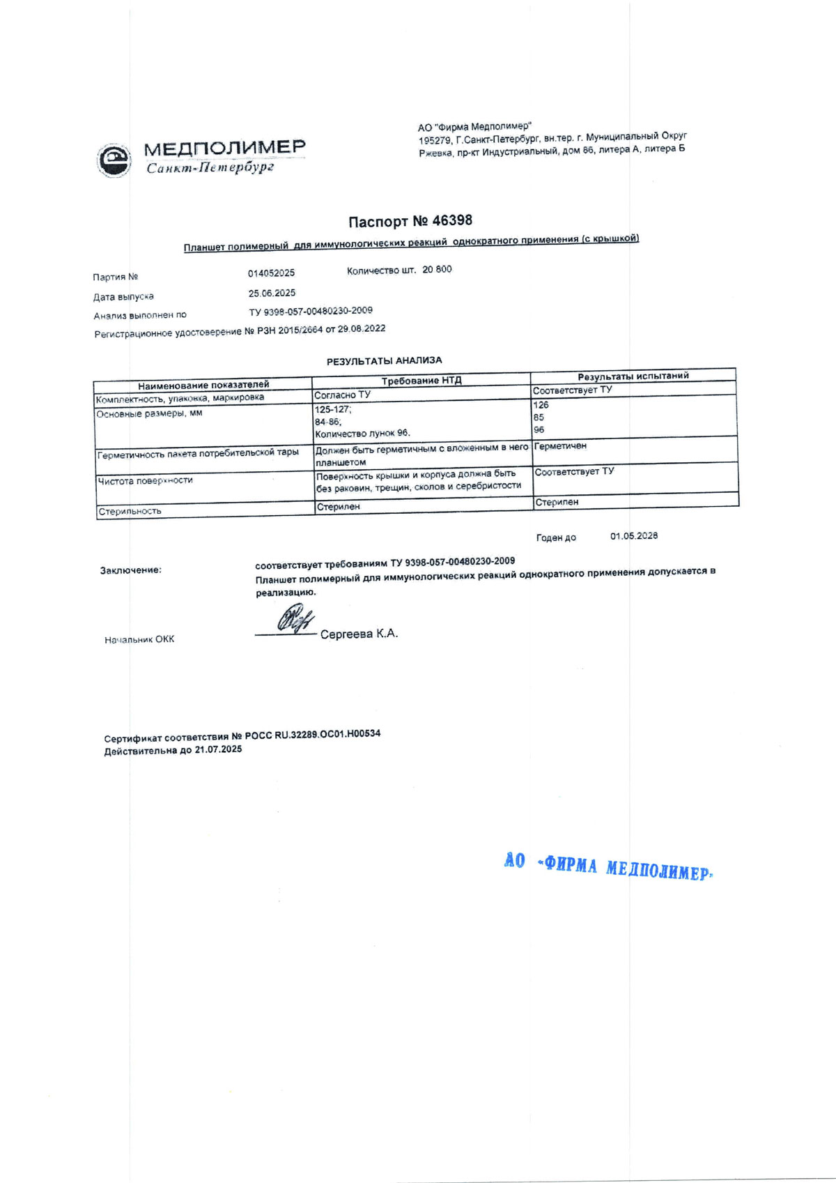 - Планшет полимерный для иммунологических реакций, п. 016062025 до 01.06.2028