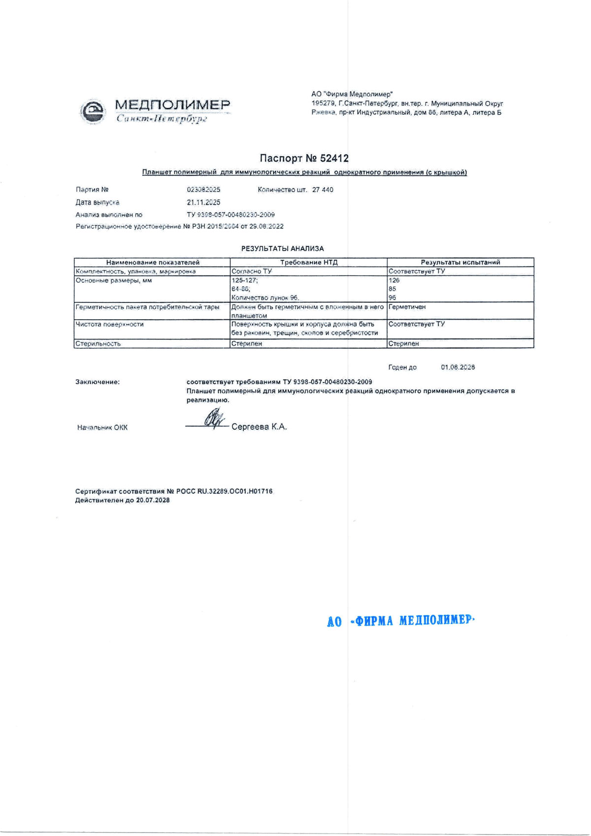 - Планшет полимерный для иммунологических реакций, п. 023082025 до 01.08.2028