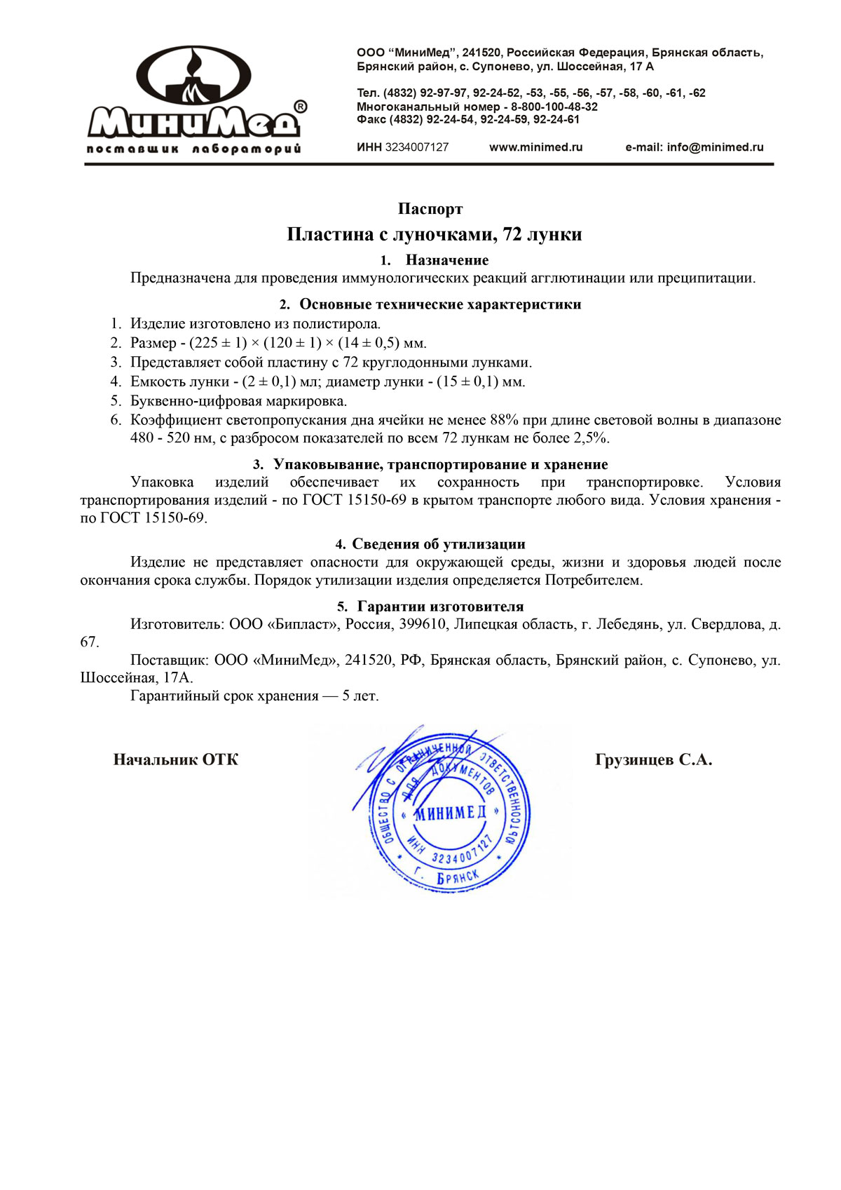 Предназначена для проведения серологических реакций агглютинации или преципитации. Представляет собой полистирольную пластину с 72 круглодонными лунками. Имеет буквенно-цифровую маркировку, максимально облегчающую организацию анализа.