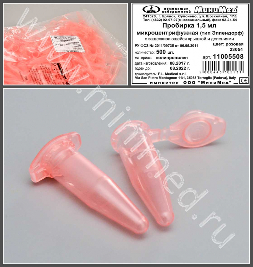 Пробирка микроцентрифужная розовая 1,5 мл с пробк.,типа "Эппендорф",с дел.,п/п, уп.500 шт, FL medical