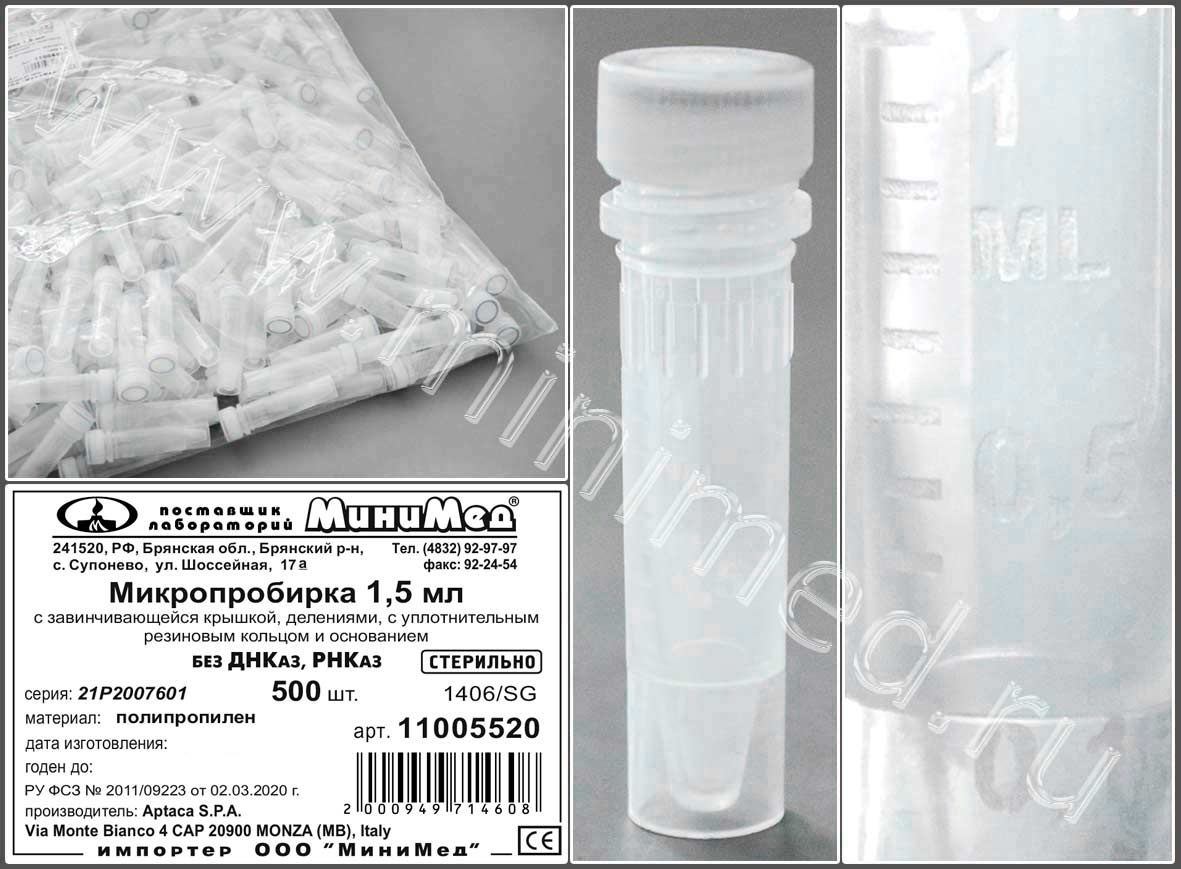 Микропробирка 1,5 мл, п/п ,с завинч.крышкой,стер.,с уплотн.резиновым кольцом,с юбкой,б/ДНК-аз,РНК-аз, уп.500/1000шт., Aptaca