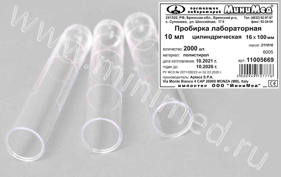 Пробирка лабораторная 10 мл, цилиндрическая,16*100,п/с, уп.2000 шт, Aptaca