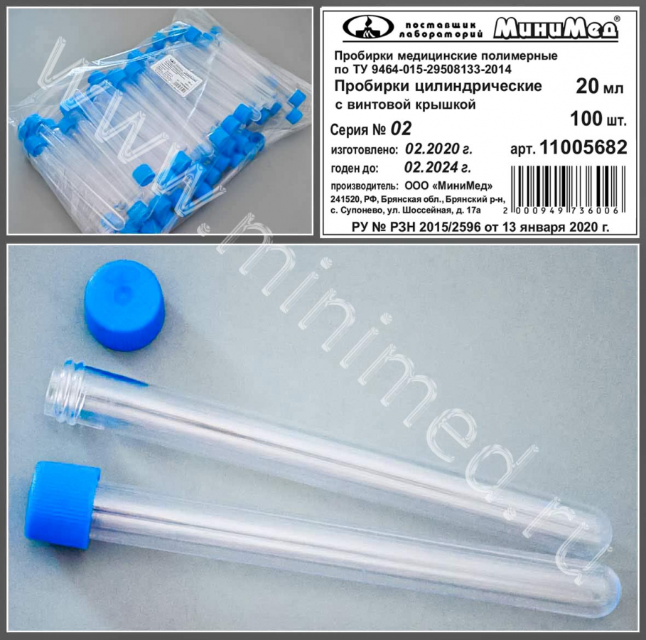 Пробирка цилиндрическая с винтовой крышкой, 20 мл,16×150 мм, ТУ 9464-015-29508133-2014, б/дел, н/стерил., п/с, МиниМед, уп.100 /1200 шт