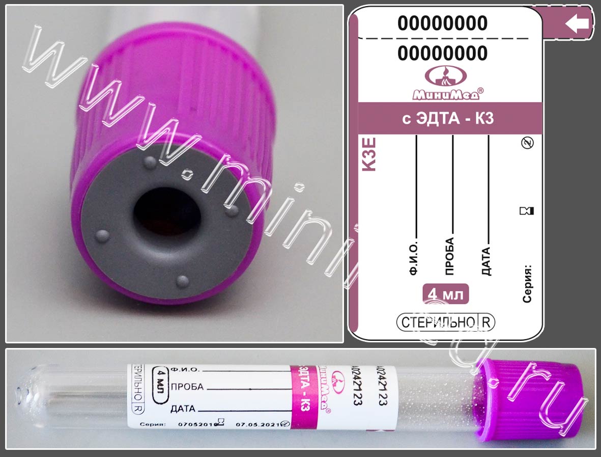 Пробирка вакуумная МиниМед с К3-ЭДТА, 4 мл, 13×100мм, фиолетовый, ПЭТФ, уп.100 шт,