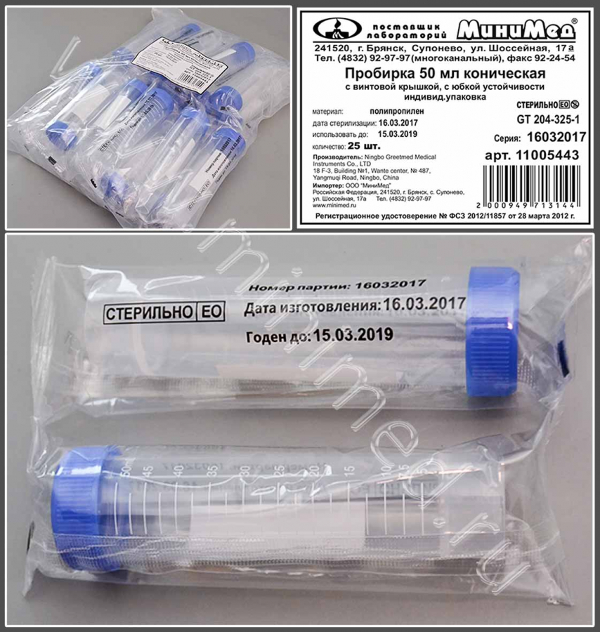 Пробирка 50 мл коническая, с винтовой. крышкой, с дел.,с юбкой уст-ти,п/п,инд.уп./25шт,стерильная, Гритмед