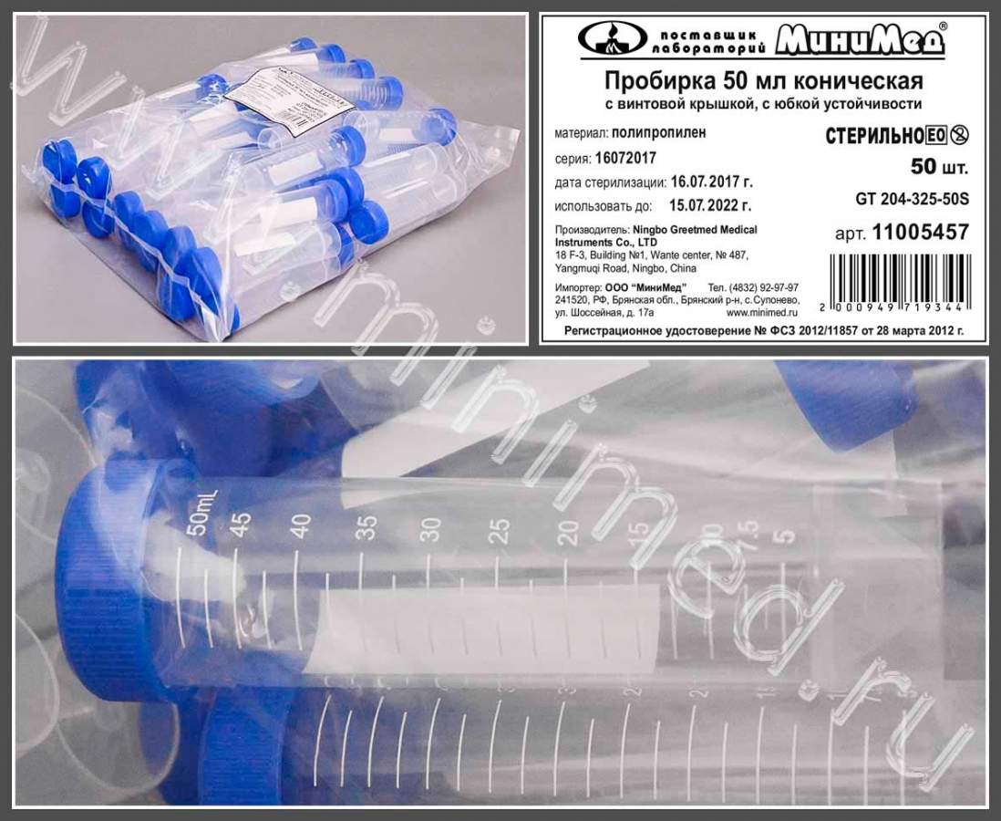 Пробирка 50 мл коническая, с винтовой. крышкой, с дел.,с юбкой уст-ти,п/п, стерильная, уп.50/500 шт, Гритмед