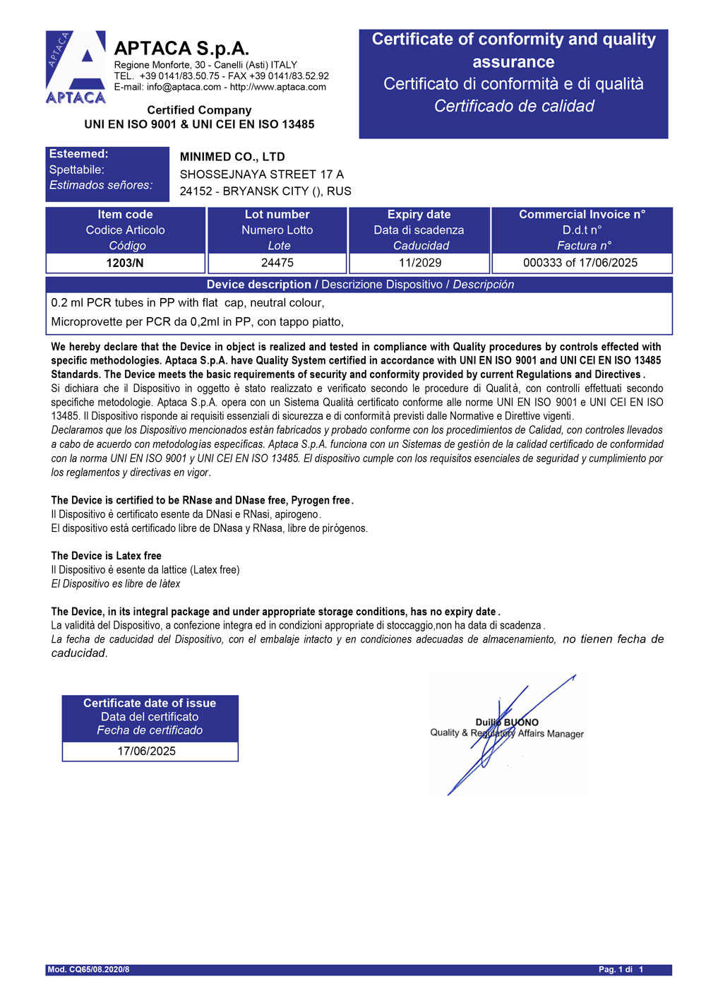 - Сертификат-1203-N. Микропробирка 0,2 мл, для ПЦР,с плоской крышкой. Лот 25225 до