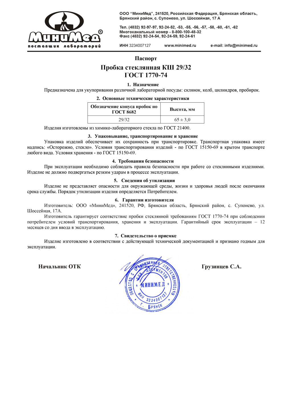 Пробка стеклянная КШ 29/32, пустотелая, МиниМед, уп.10 /100шт.