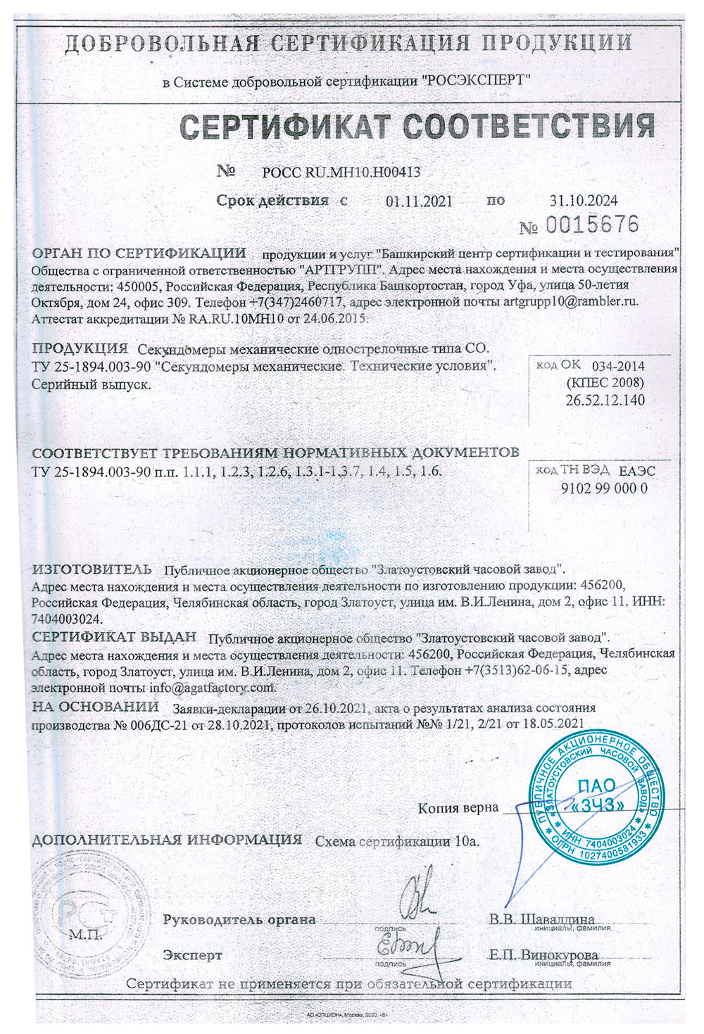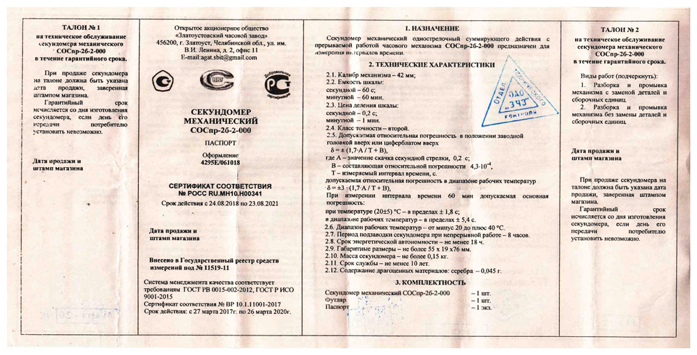 - Секундомеры механические. ОАО ЗЧЗ. Письмо сертификации и о внесении в госреестр