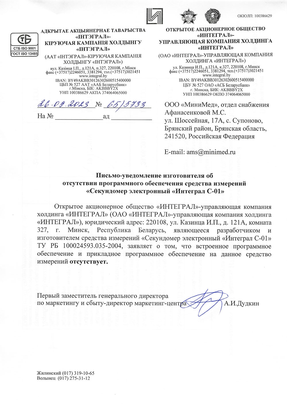 - Секундомер электронный ИНТЕГРАЛ С-01. Исх. письмо от 26.09.2023 № 65-5733 об отс