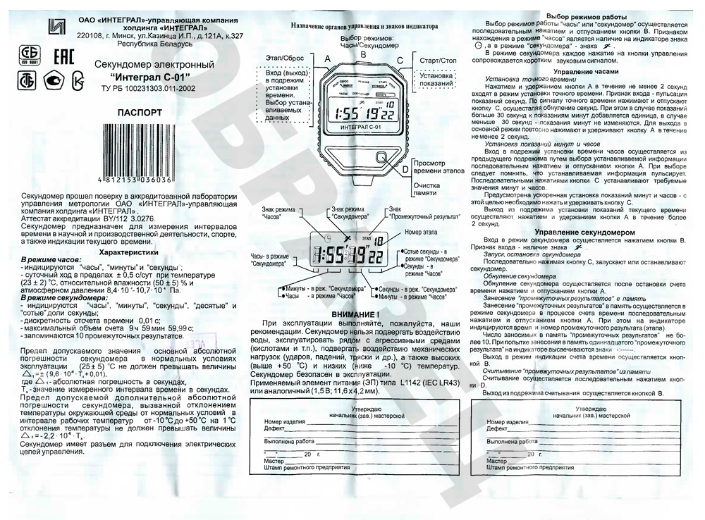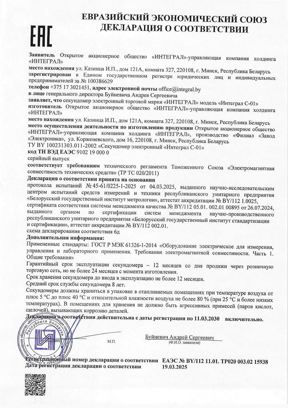 - Секундомер электронный Интеграл С-01. Декларация ЕАЭС до 11.03.2030