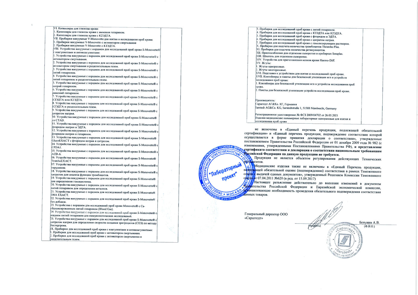 - Изделия мед полим лаб однор для взятия и исслед проб крови. Сарштедт.Германия. И