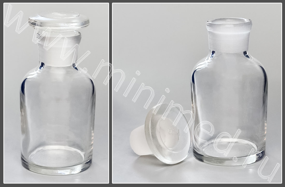 Склянка лабораторная 60 мл из светлого стекла с узкой горловиной и притертой пробкой, уп. 12/144 шт