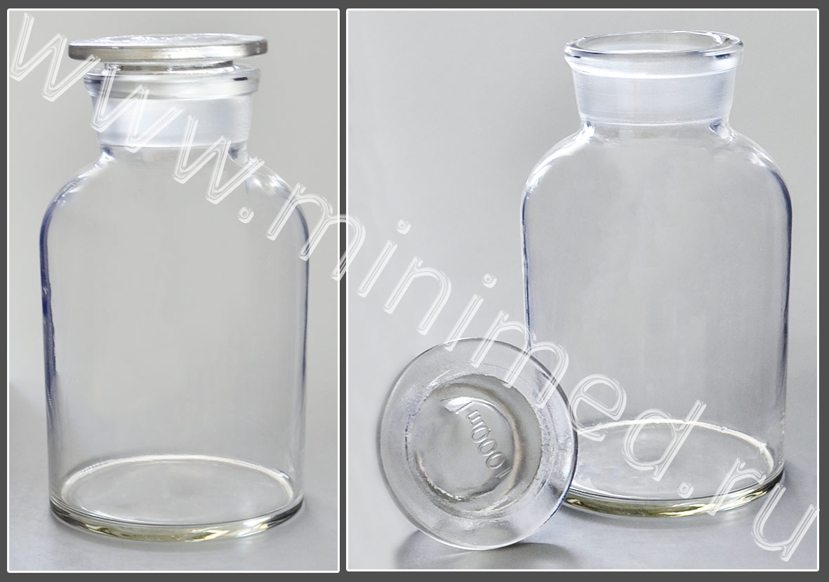 Склянка лабораторная 1000 мл из светлого стекла с широкой горловиной и притертой пробкой, уп.6 /24 шт