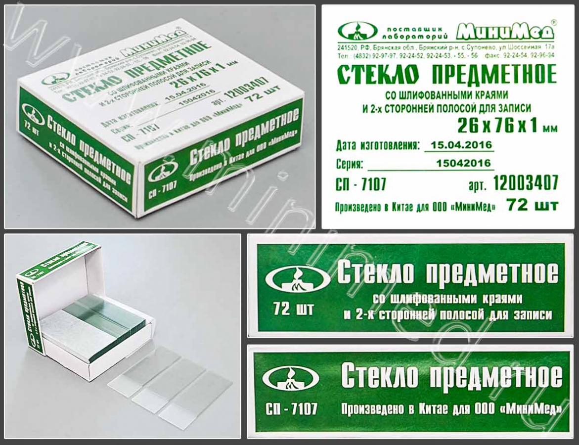 Стекло предметное СП-7107, 76*26 мм,толщ.1,0 мм, с шлиф.краями, с 2-х сторонней полосой, уп.72/3600 шт