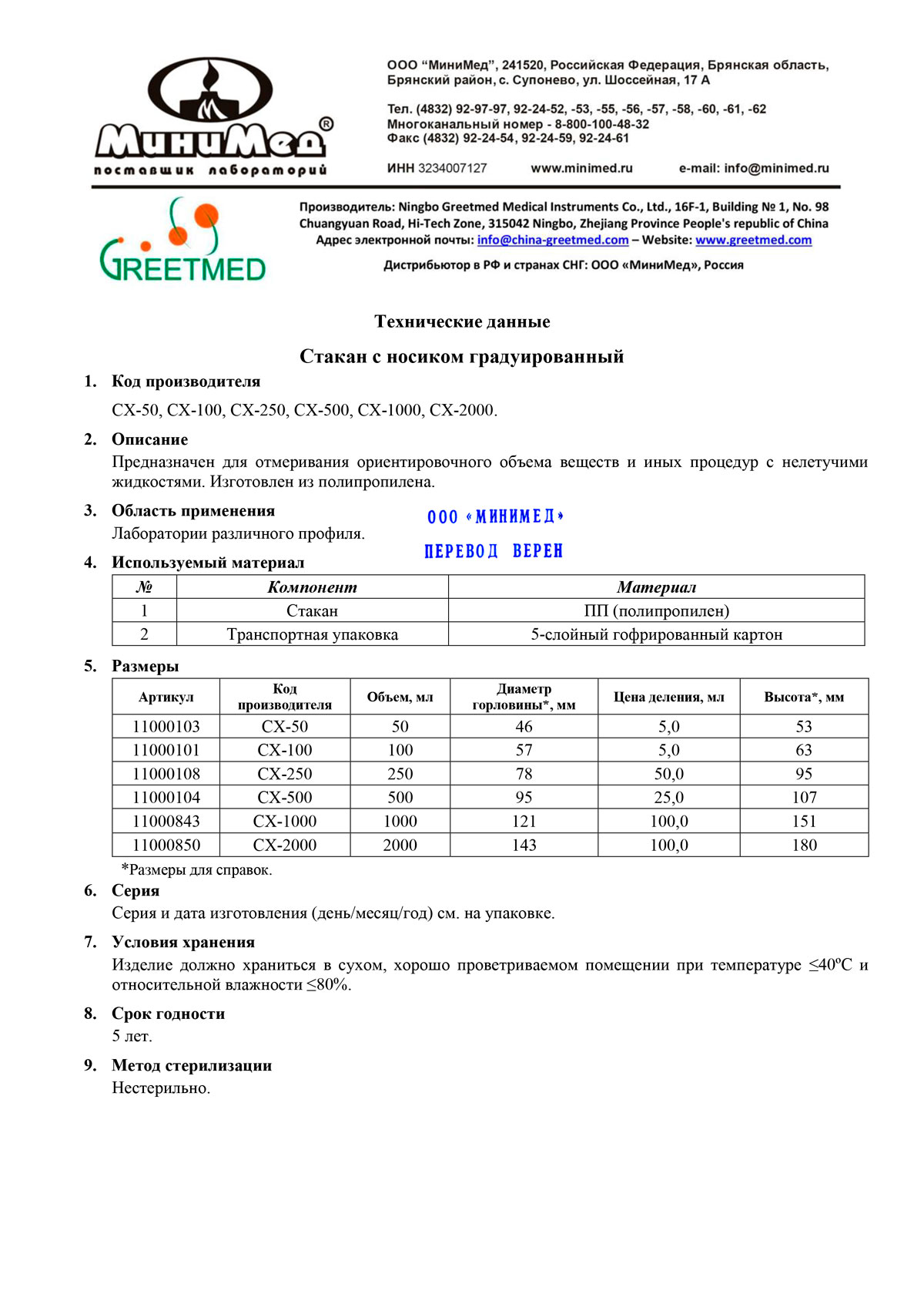 Предназначен для отмеривания ориентировочного объема веществ и иных процедур с нелетучими жидкостями. Изготовлен из специального особо прозрачного полипропилена, выдерживает автоклавирование при температуре +121°С. Стакан с носиком и рельефной градуировкой.