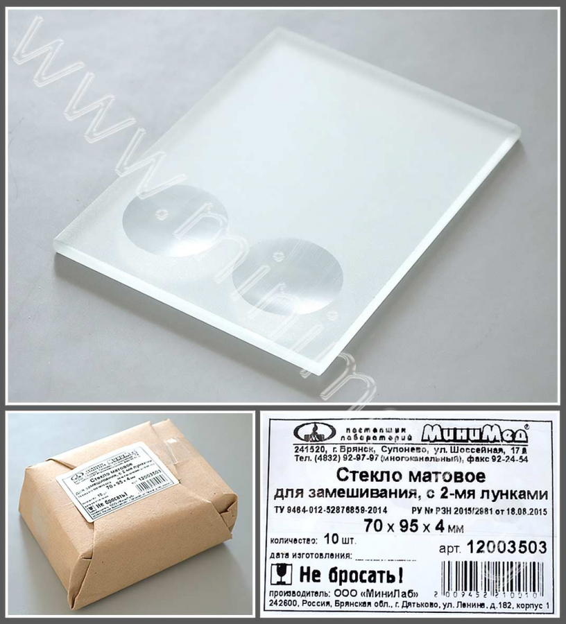 Представляет собой стеклянную пластину со шлифованными краями, глянцевой поверхностью с одной стороны и матовой - с другой. Предназначено для замешивания порошков и других материалов при лабораторных работах. Изготовлено из прозрачного бесцветного силикатного стекла.
