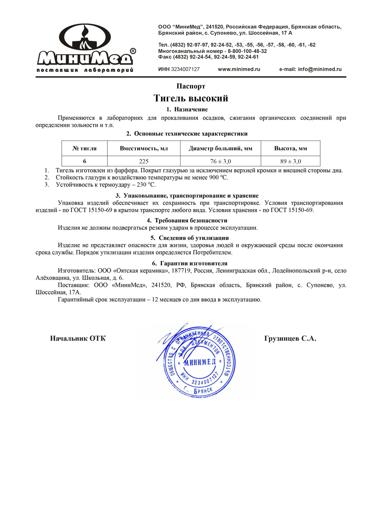 Тигель №6 высокий 225 мл, D76 H89, уп.1 шт