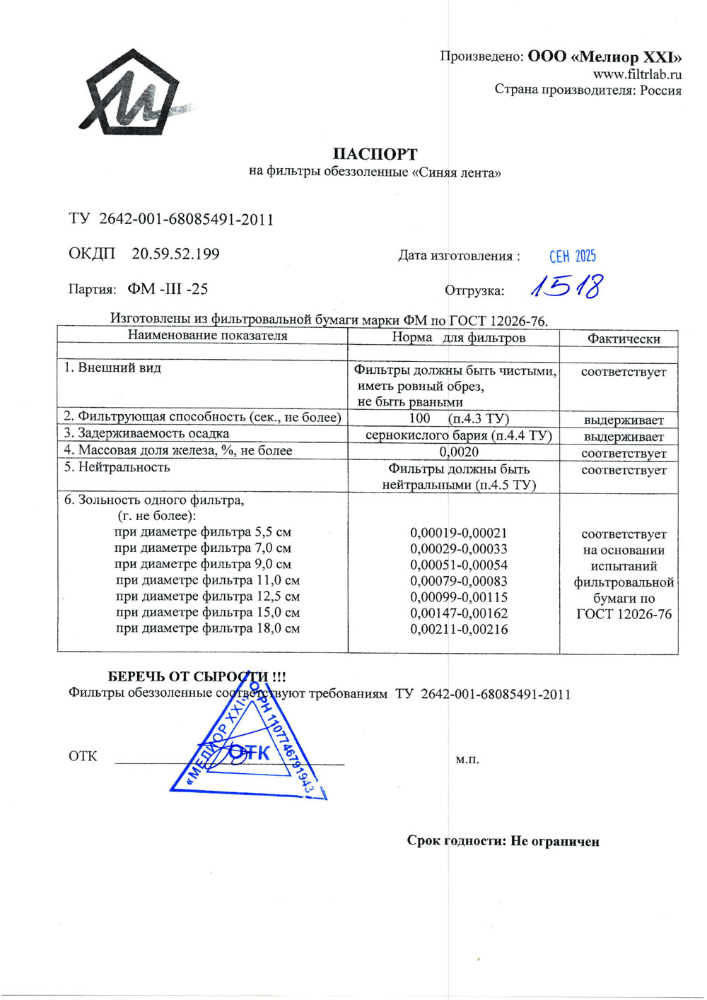 Фильтры обеззоленные предназначены для использования в лабораториях научно-исследовательских организаций, а также в школьных лабораториях для качественного и количественного анализа, а частности для отделения от раствора мелкокристаллических осадков. Фильтр задерживает осадок сернокислого бария.