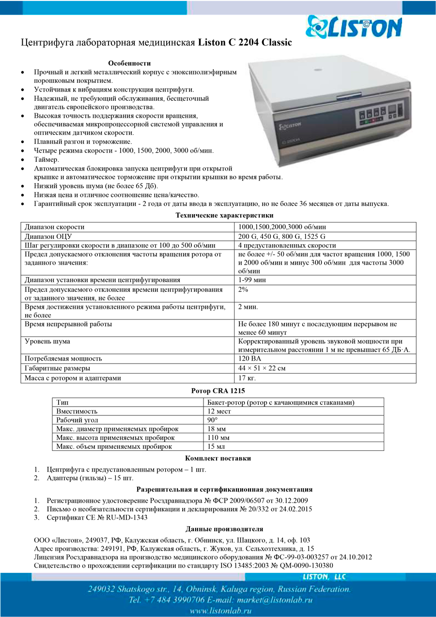 Центрифуга лабораторная медицинская Liston C2204 Classic (в комплекте с ротором CRA 1215 и адаптерами САА.15.1-24.18.120 на 15мл. 18*110мм.)