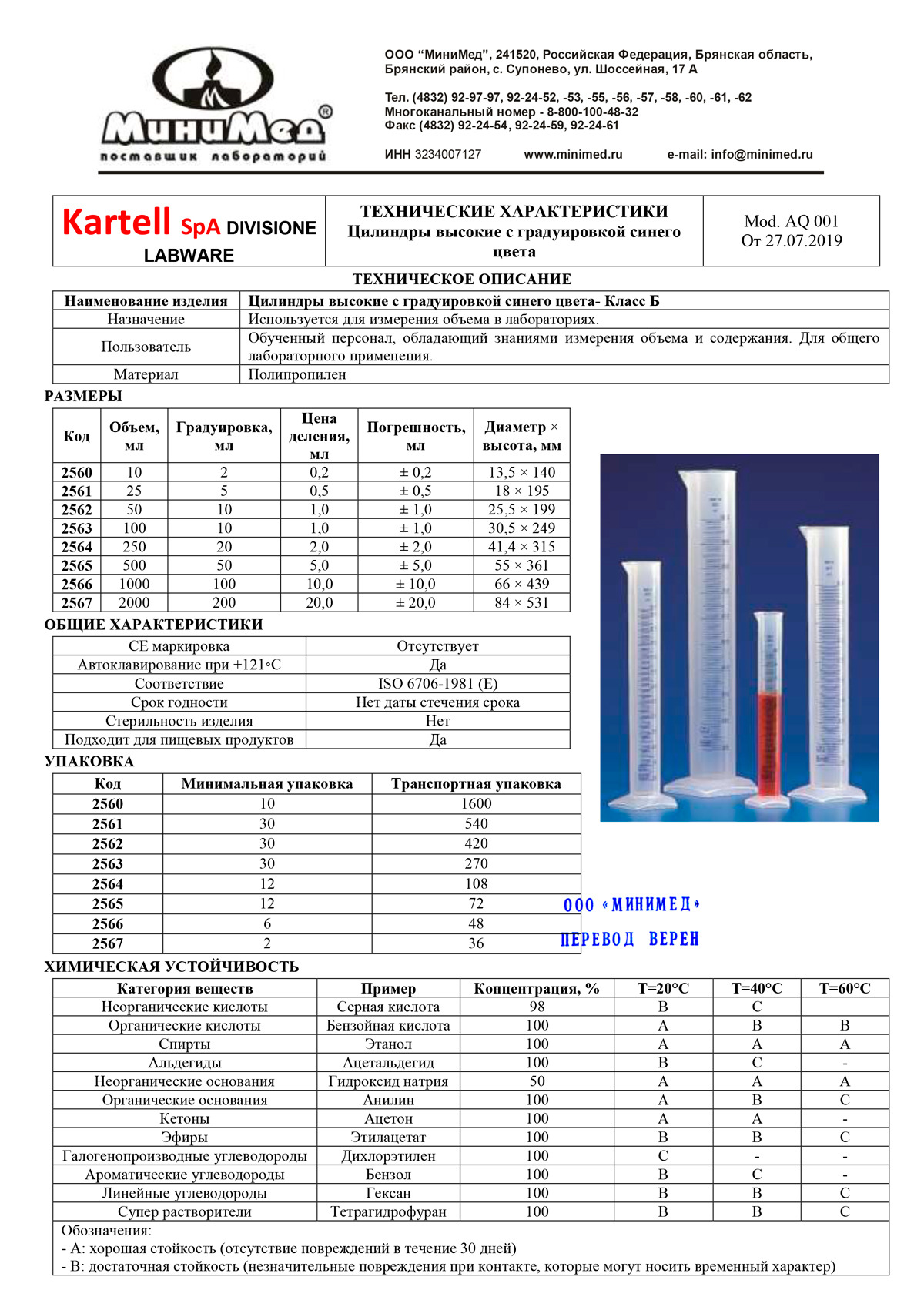 Цилиндр 100 мл с дел.,высокий,п/п-Kartell, шт