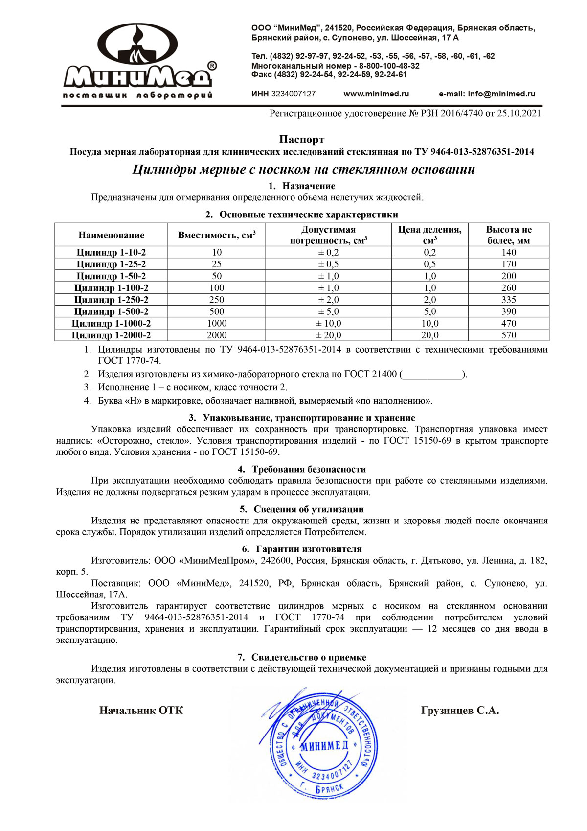 - Цилиндры исполнений 1, 3. МиниМедПром. Свидетельство ТСИ Беларусь до 04.09.2027