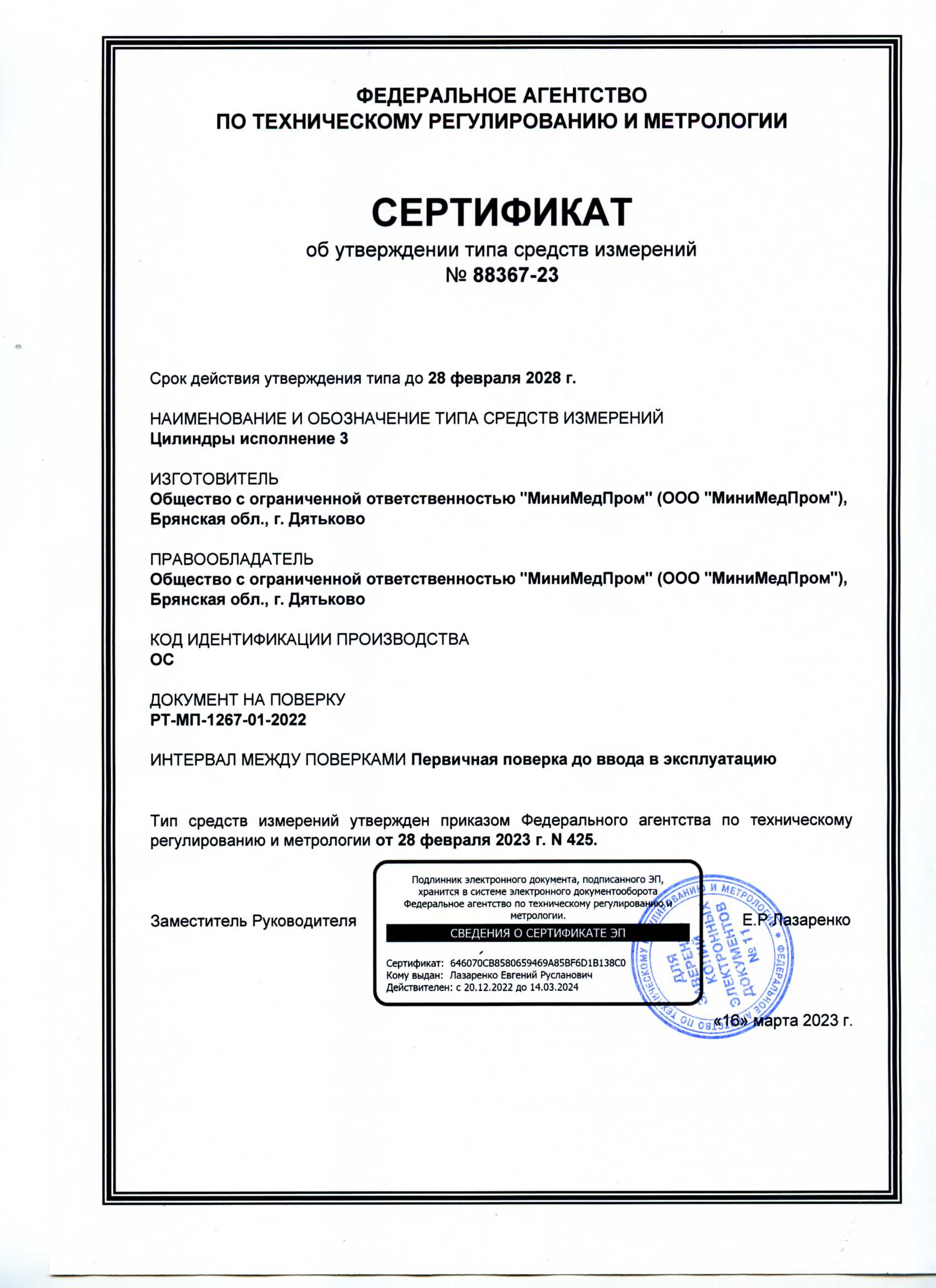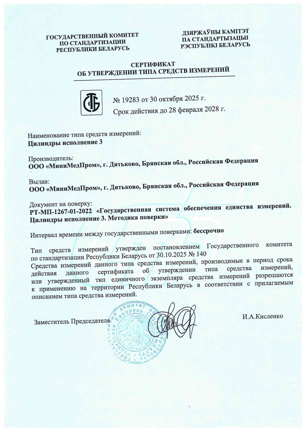 - Цилиндры исполнений 1, 3. МиниМедПром. Свидетельство ТСИ Беларусь до 04.09.2027