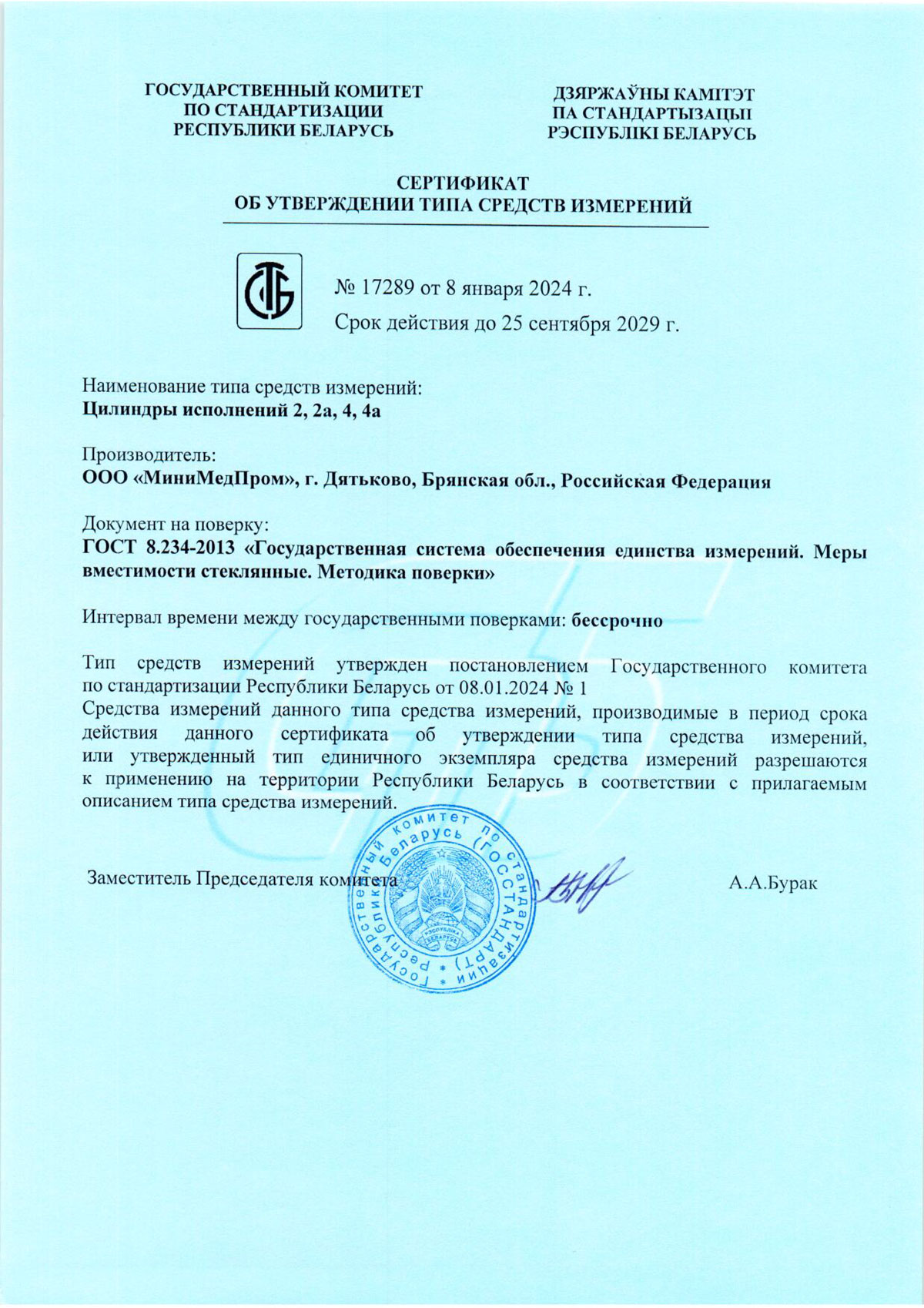 - Цилиндры исполнений 2, 2а, 4, 4а. ММП. Свидетельство ТСИ Беларусь до 25.09.2029