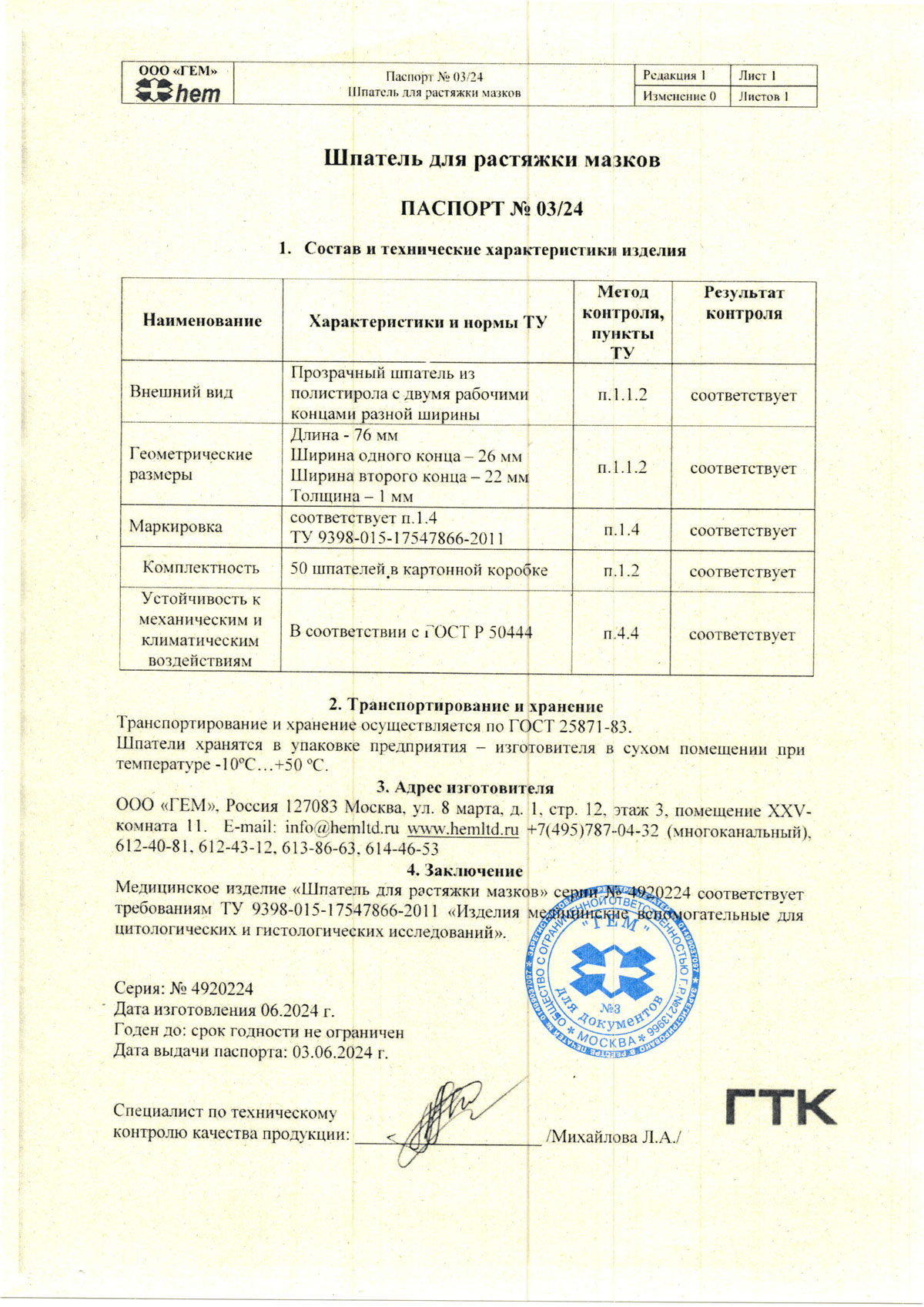 Шпатель предназначен для изготовления мазков крови на предметных стеклах. Изготовлен из специального полупрозрачного механически прочного полистирола. Предназначен для однократного применения, но может подвергаться обработке детергентами и стандартными дезинфицирующими средствами. Термической стерилизации не подлежит.