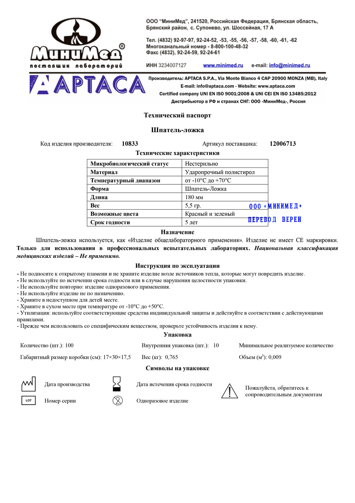 Шпатель-ложка,п/с,дл.180 мм, уп.10/200шт, Aptaca##остатки-САНКЦИИ