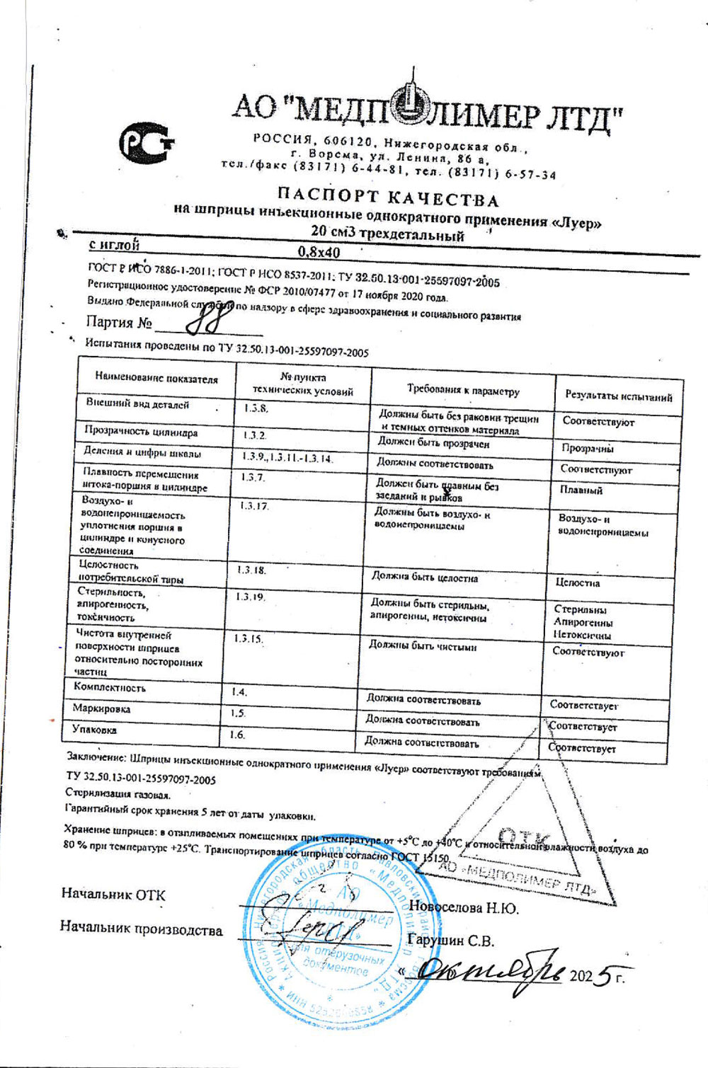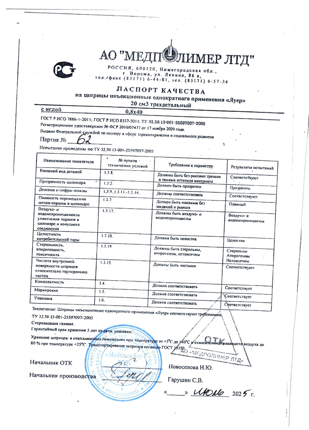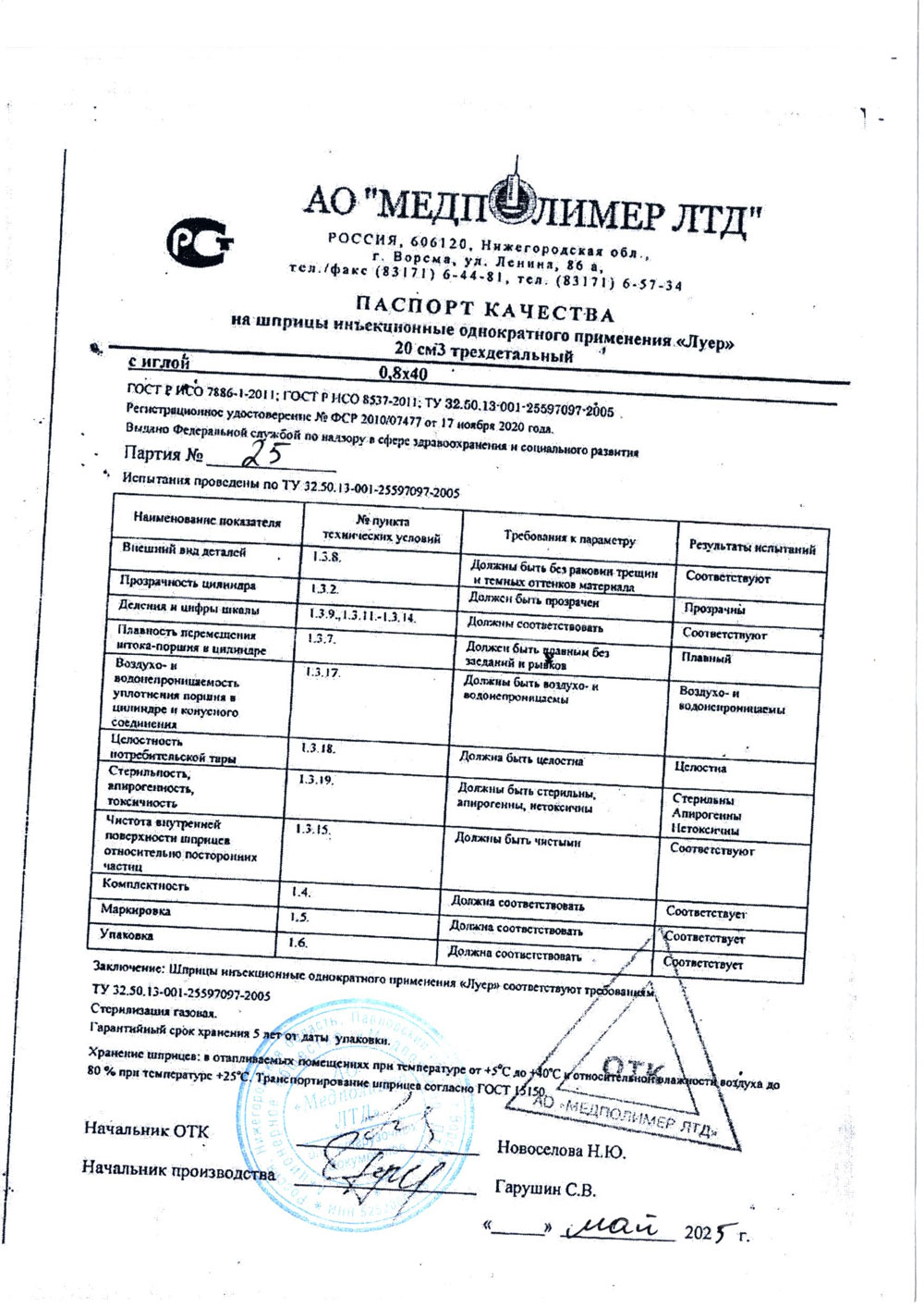 Шприц изготовлен согласно требованиям ГОСТ ISO 7886-1-2011 и ТУ 32.50.13-001-25597097-2005.
