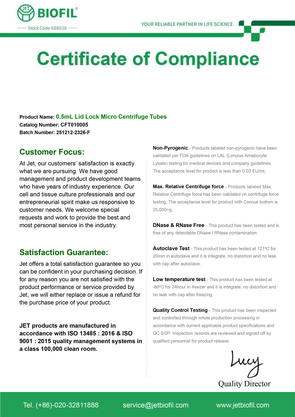 - Сертификат. Микропробирка 0,5 мл, тип Эппендорф, с дел., Jet Bio-Filtration-CFT0