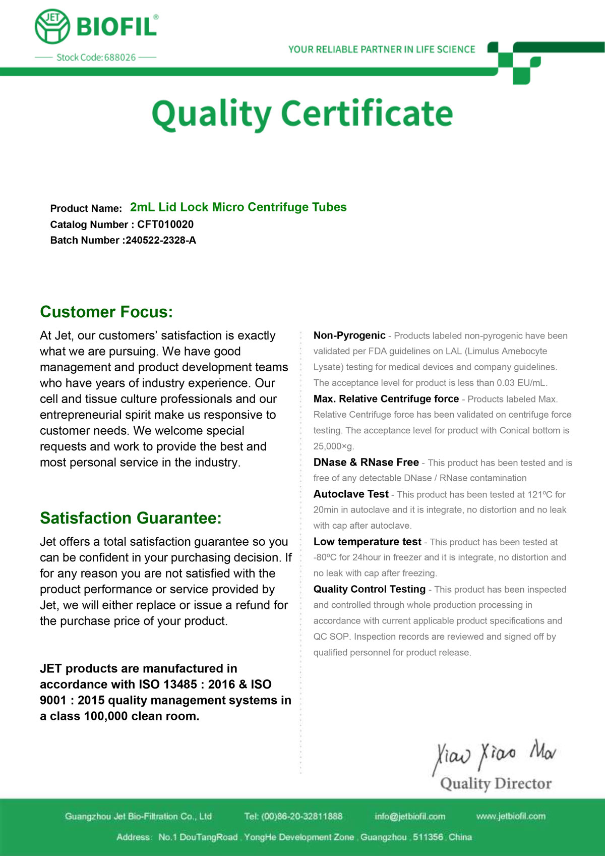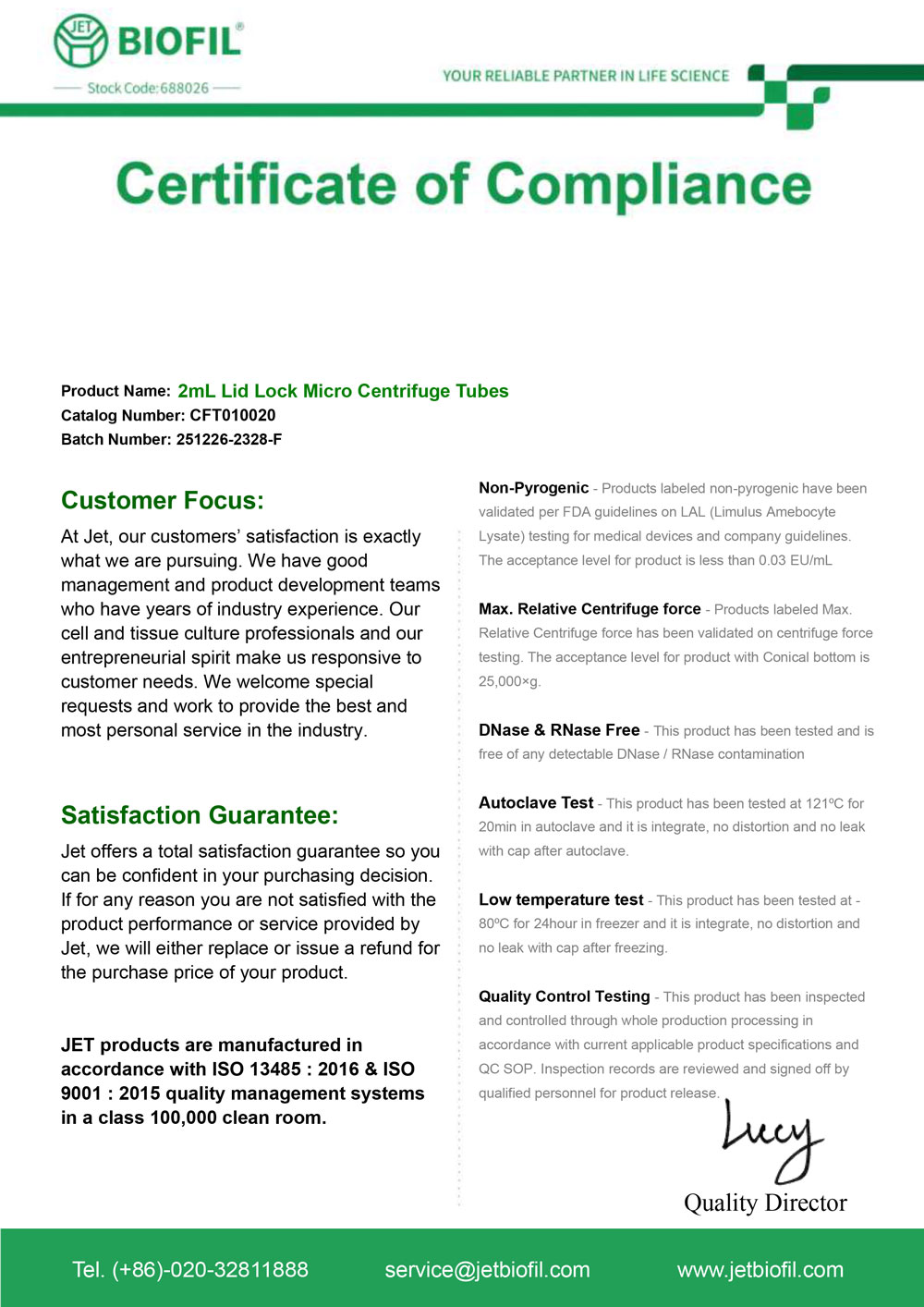 - Сертификат. Микропробирка 2 мл, тип Эппендорф, с дел., Jet Bio-Filtration CFT010
