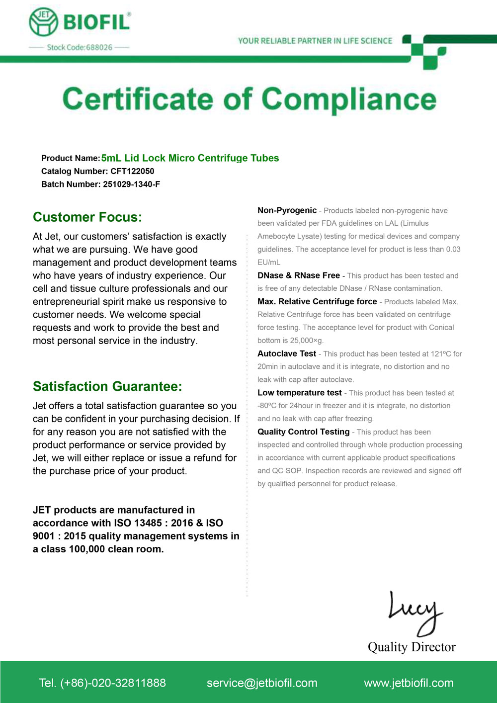 - Сертификат. Микропробирка 5 мл, тип Эппендорф, с дел., Jet Bio-Filtration, CFT12