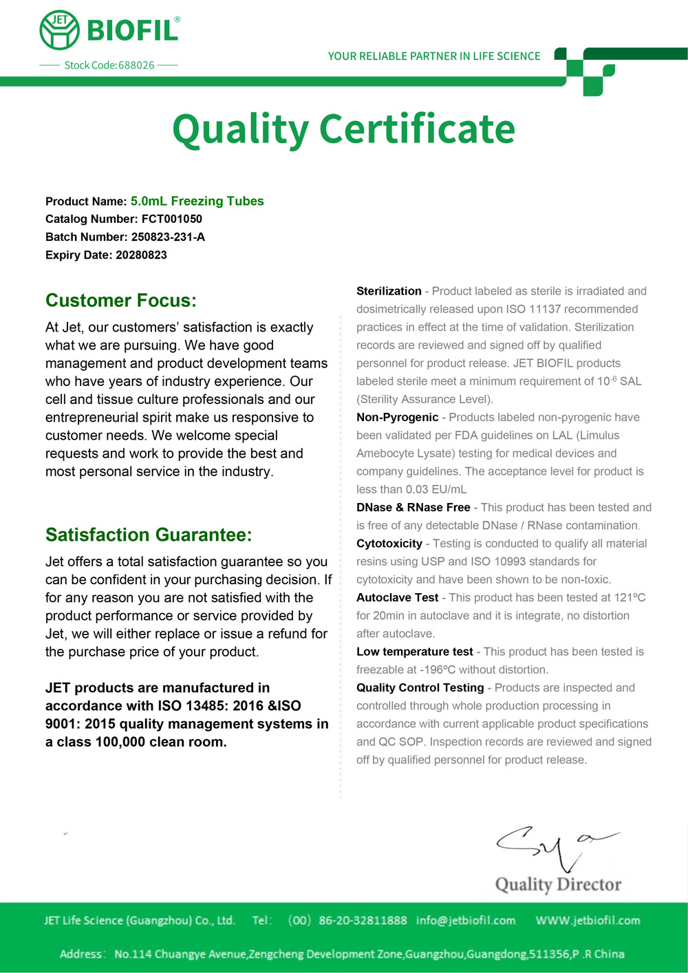 - Сертификат. Микропробирка для криохранения 5 мл, с основанием, Jet Bio-Filtratio