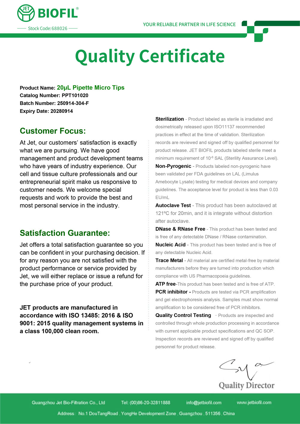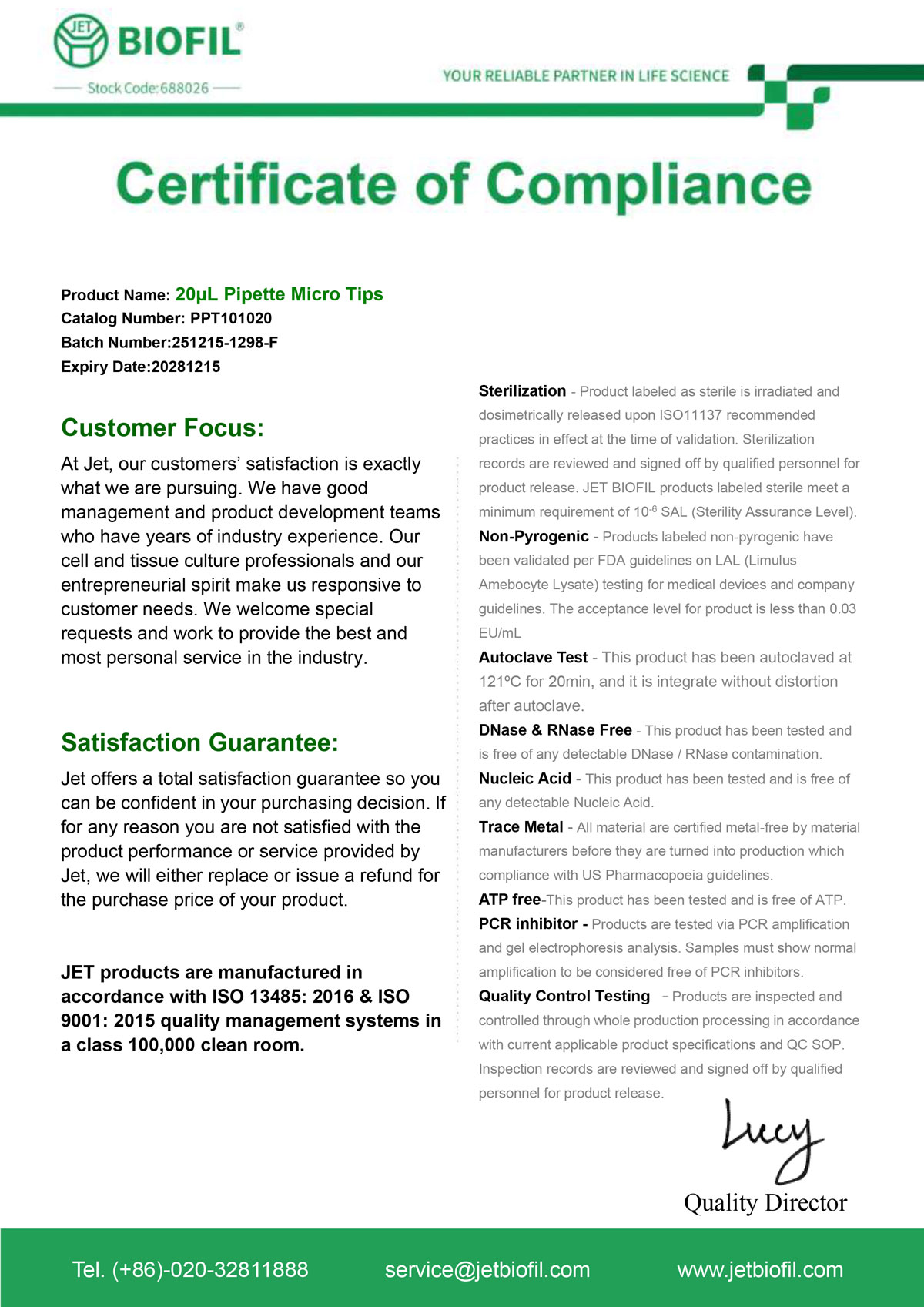 - Сертификат. Наконечник для дозаторов 2-20 мкл, Jet-Bio-Filtration, PPT101020 с.