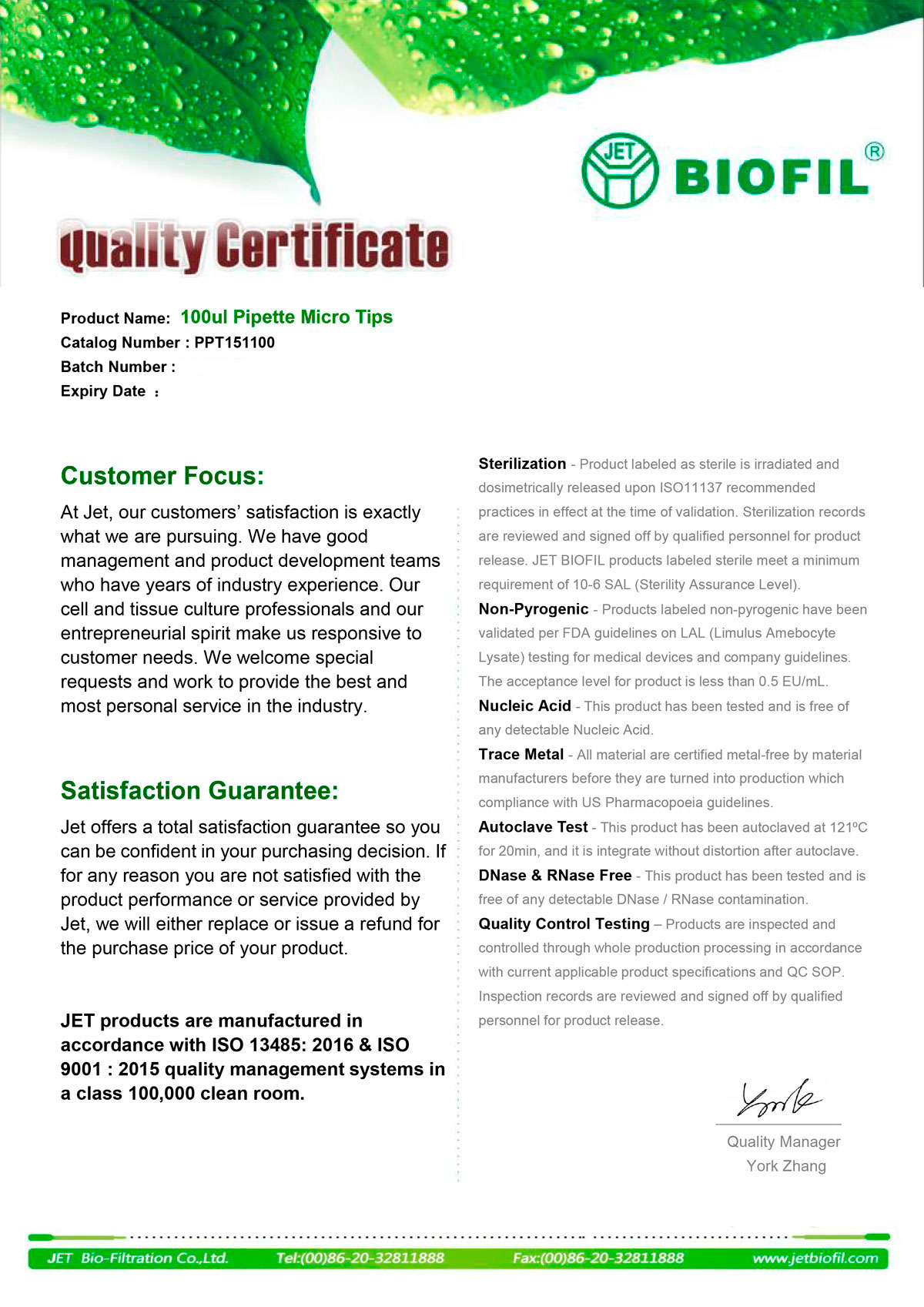 - Сертификат. Наконечник для дозаторов 10-100 мкл, Jet-Bio-Filtration, PPT151100 с.