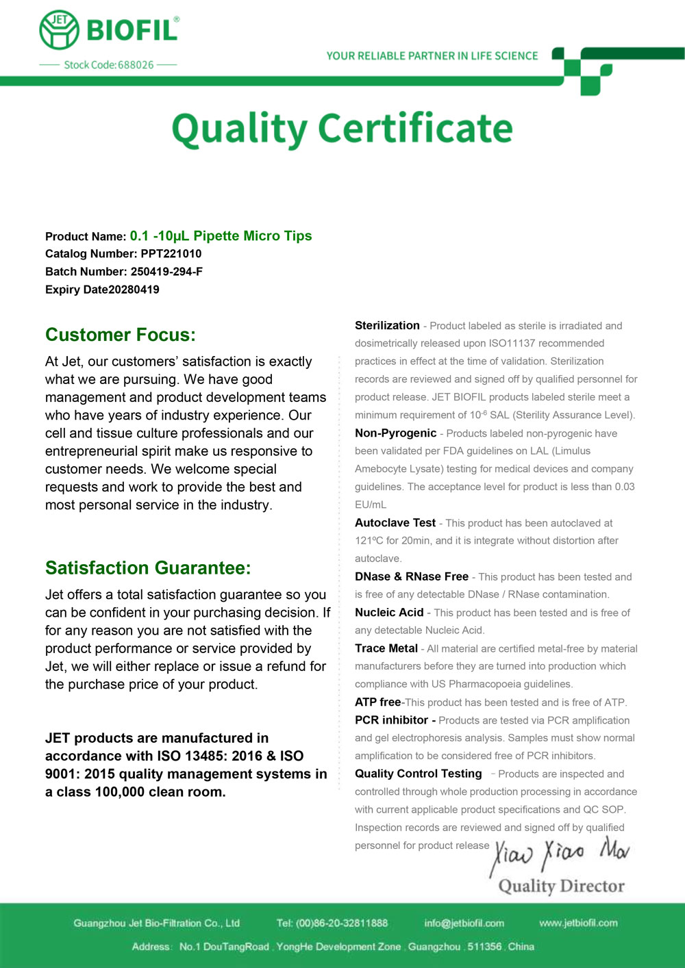 - Сертификат. Наконечник для дозаторов 0,1-10 мкл, без фильтра, Jet-Bio-Filtration,