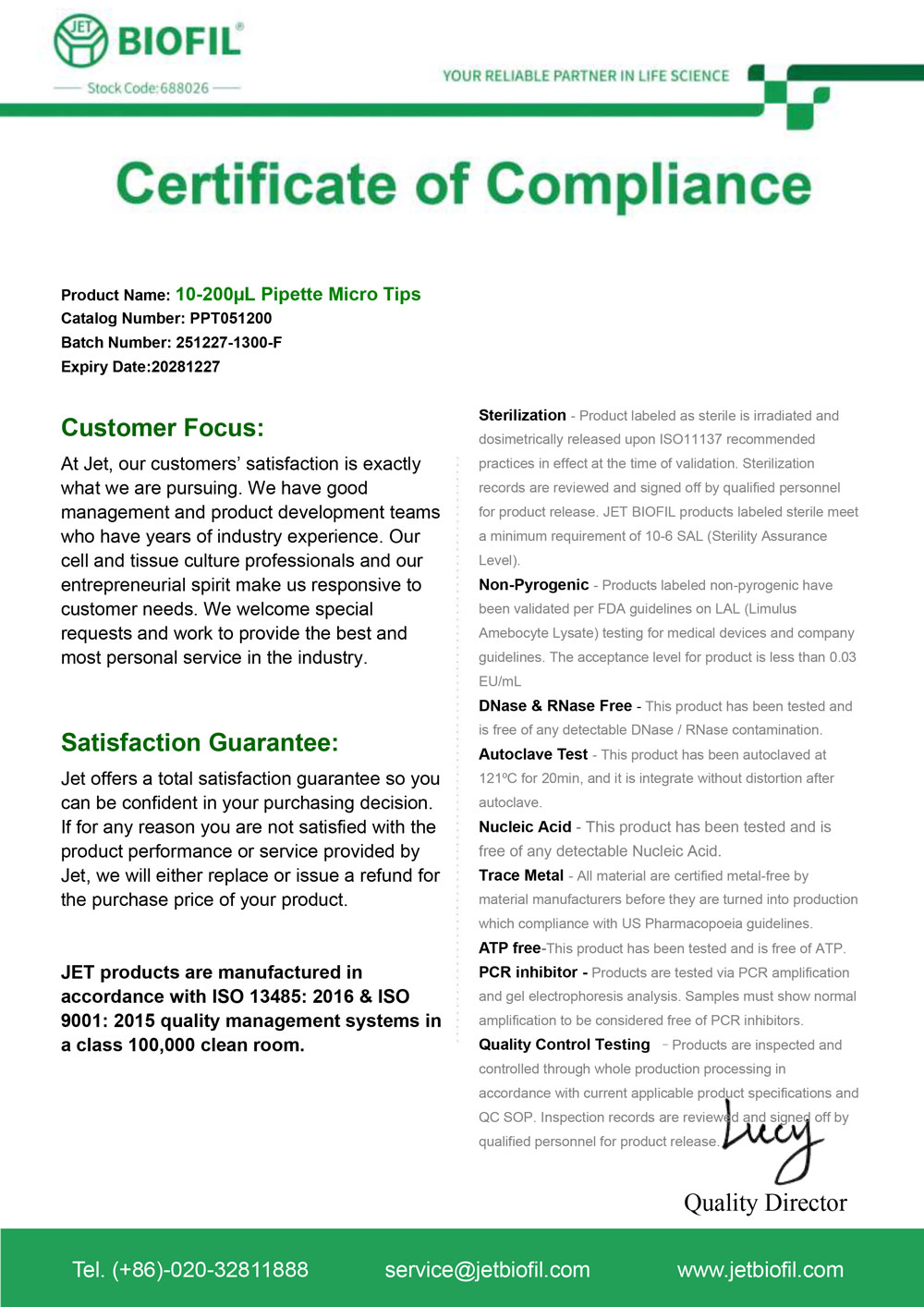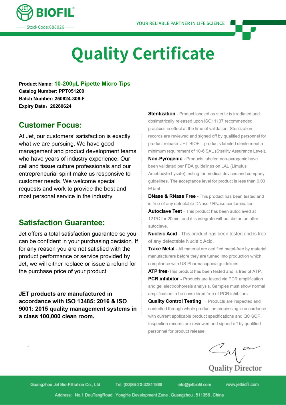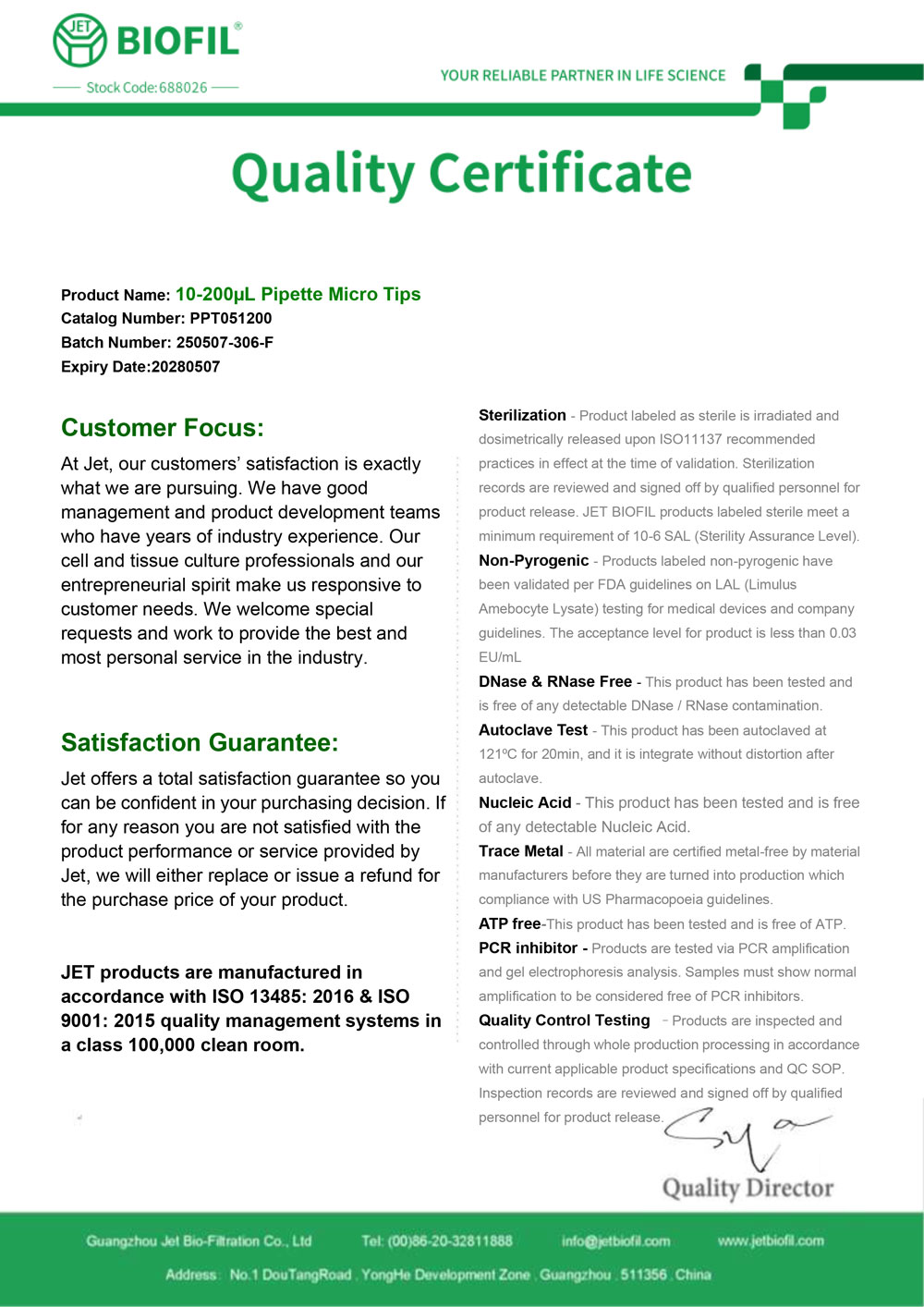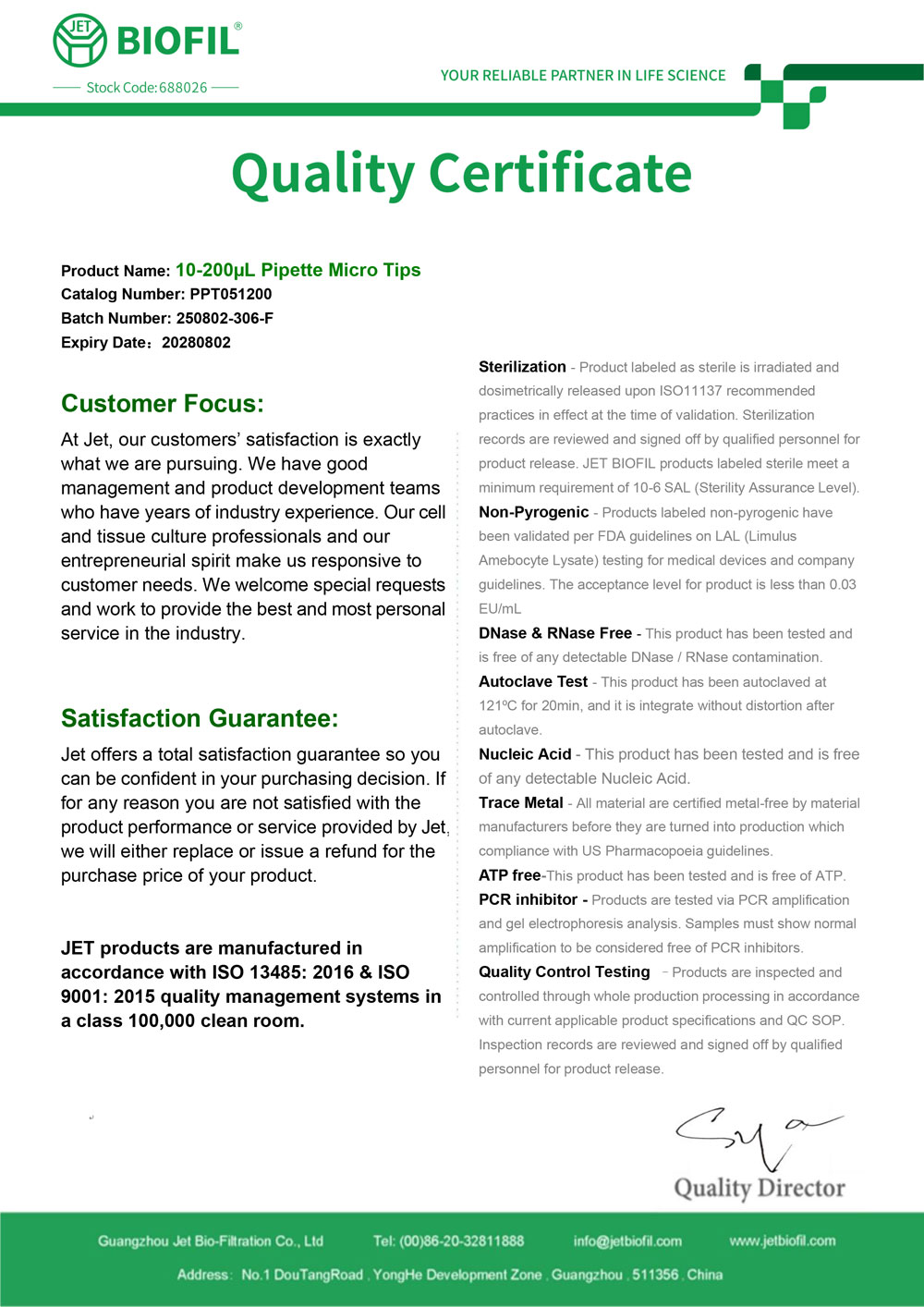 - Сертификат. Наконечник для дозаторов 10-200 мкл без фильтра, Jet-Bio-Filtration,
