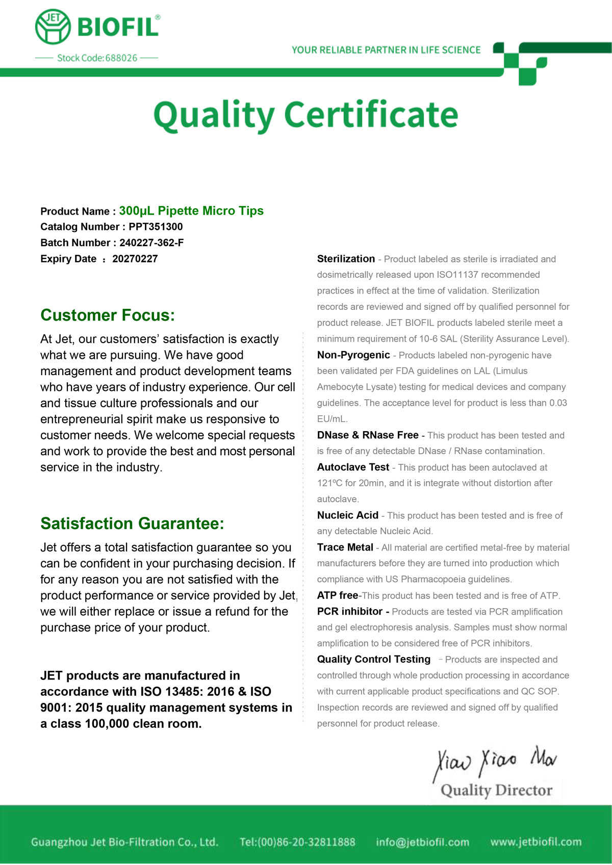 - Сертификат. Наконечник для дозаторов 10-300 мкл, без фильтра, Jet-Bio-Filtration