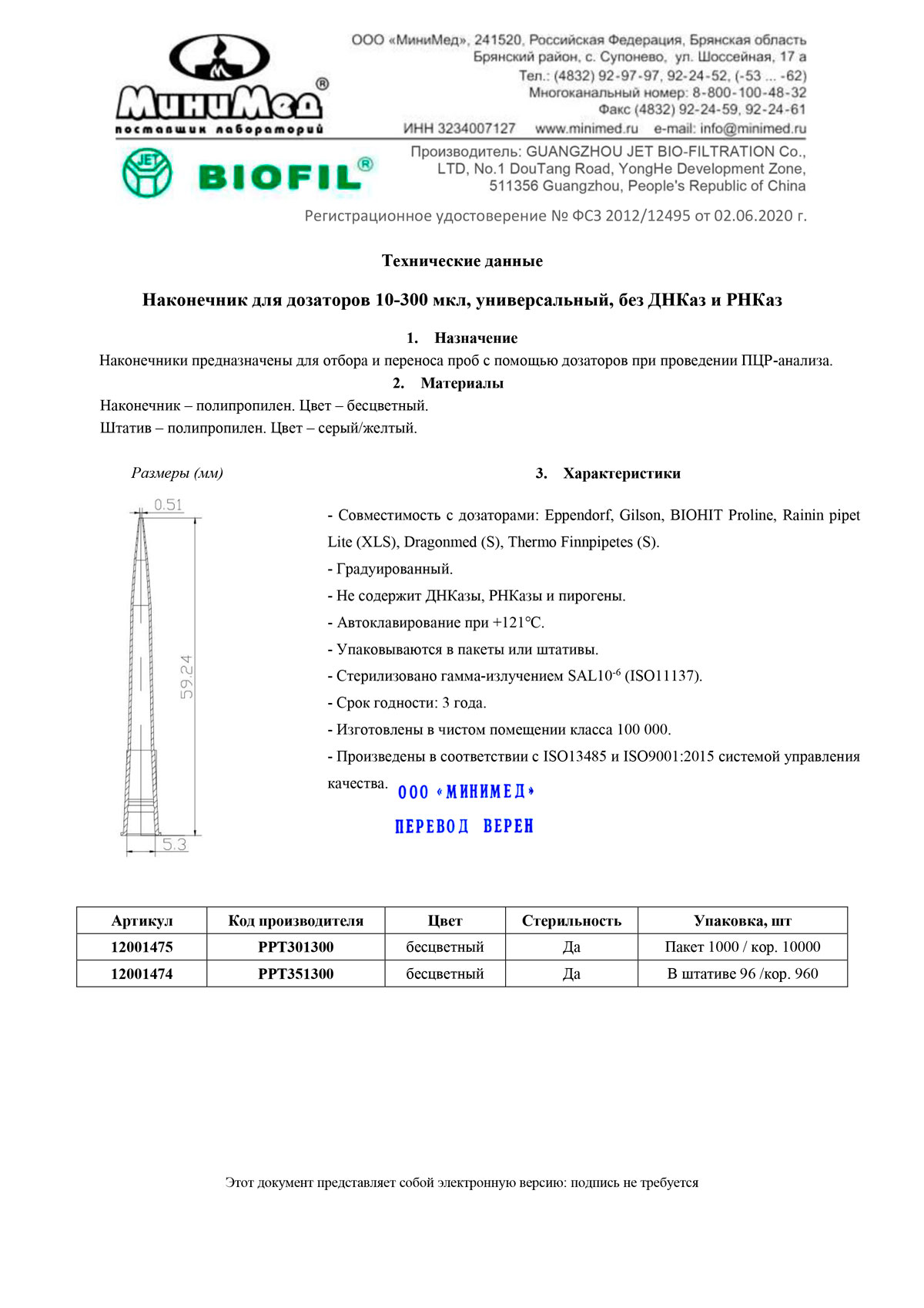 - Сертификат. Наконечник для дозаторов 10-300 мкл, Jet-Bio-Filtration, PPT301300 с
