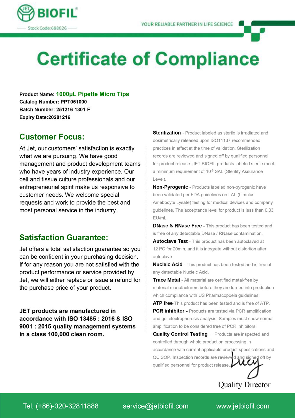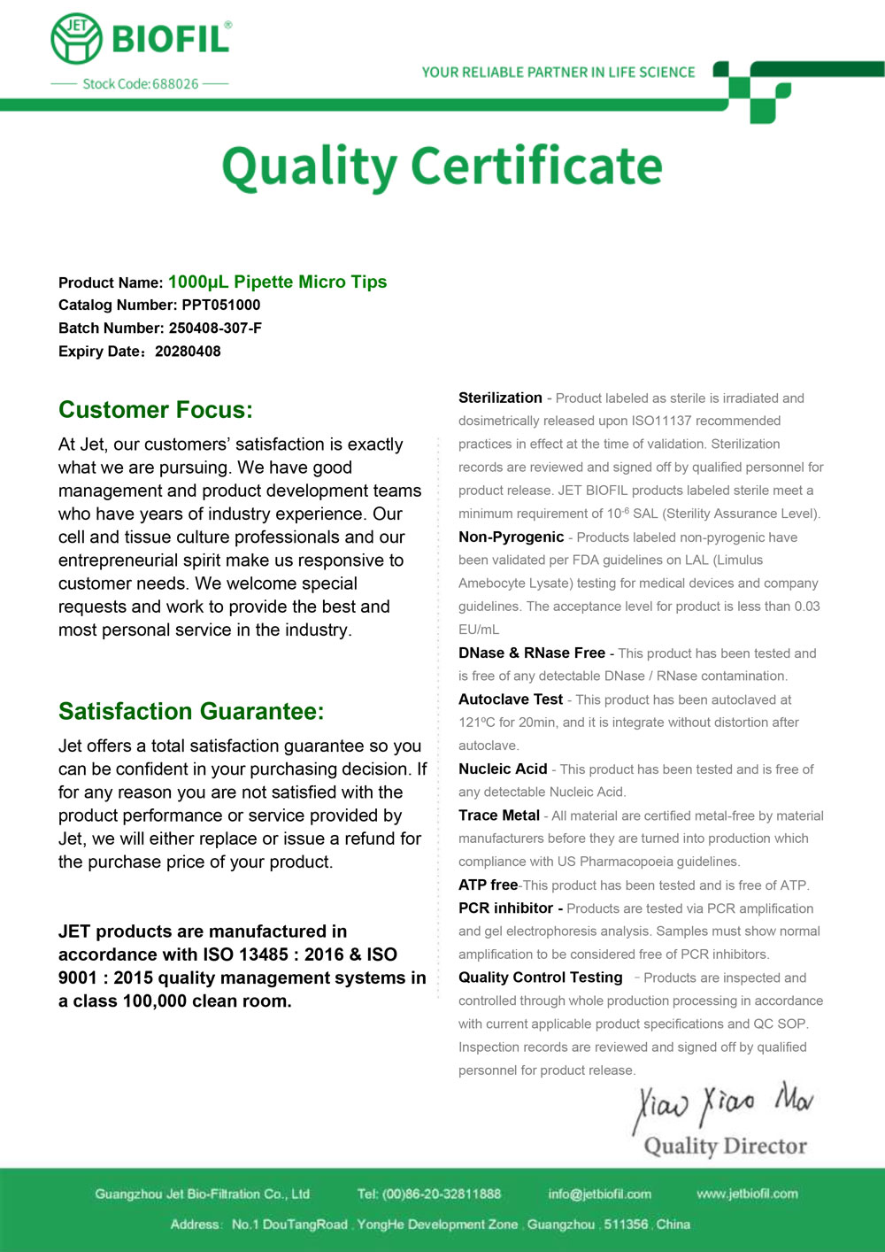 - Сертификат. Наконечник для дозаторов 100-1000 мкл без фильтра, Jet-Bio-Filtration