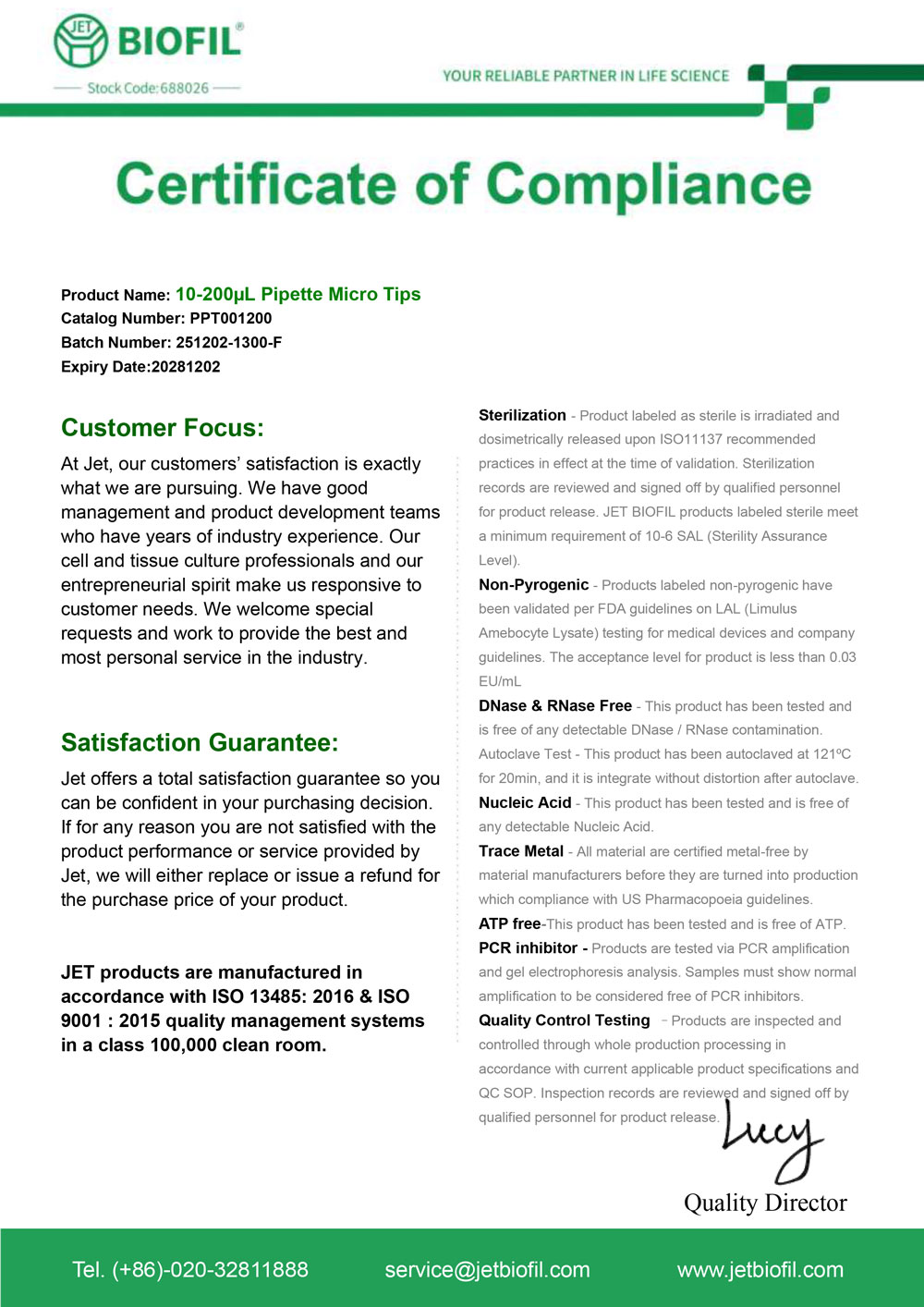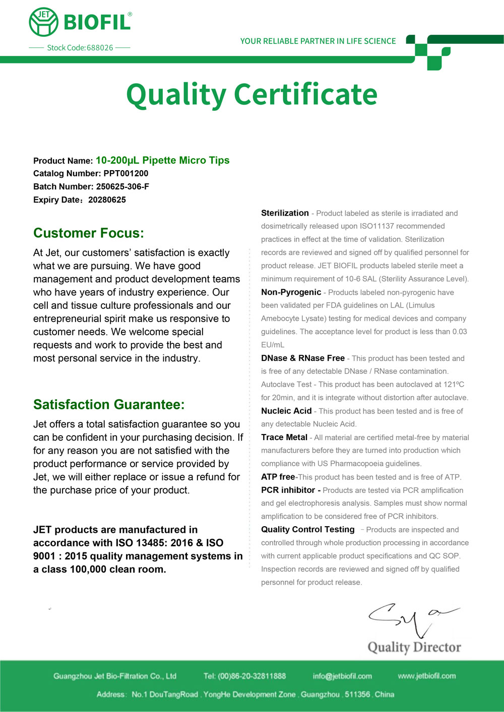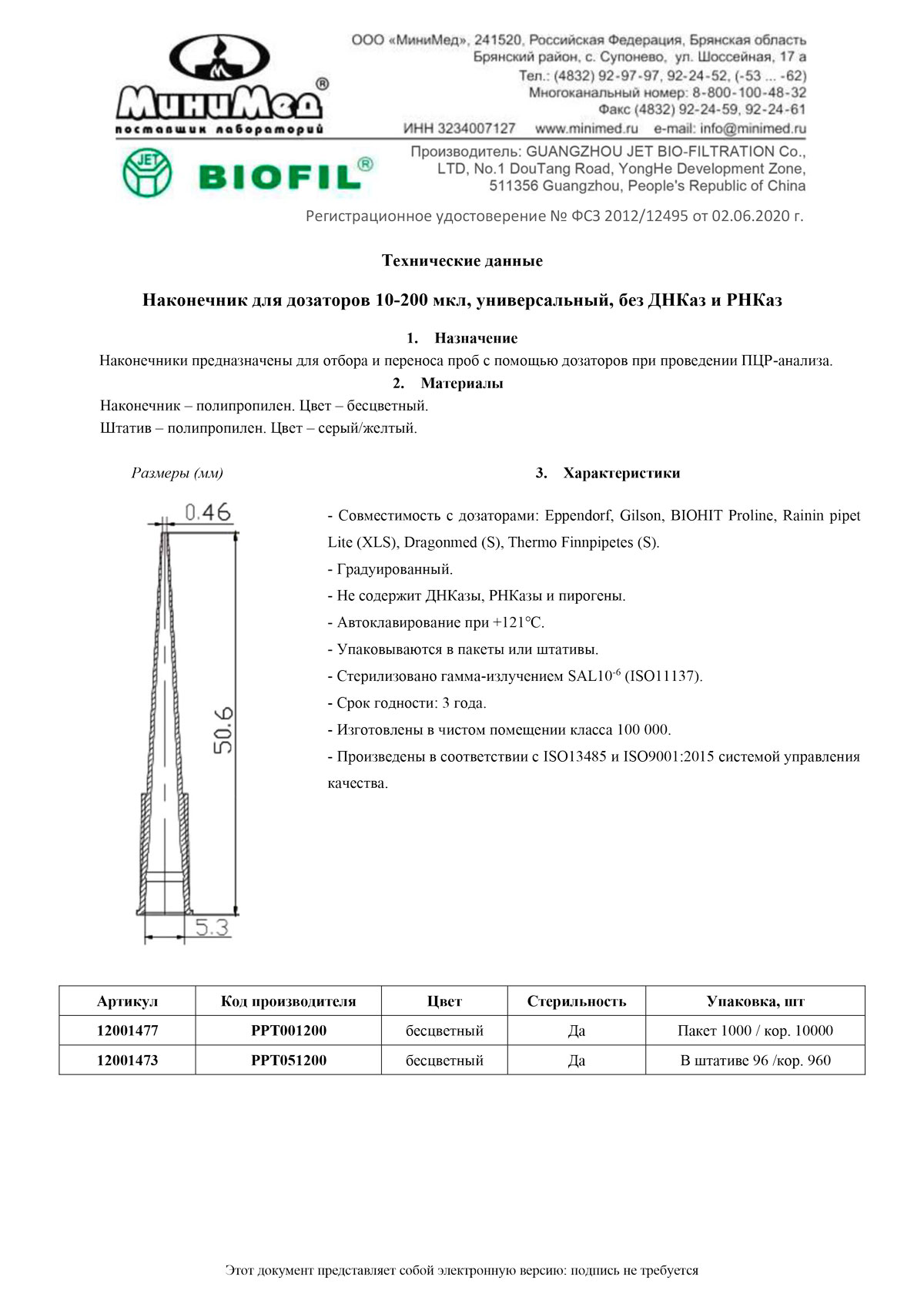- Сертификат. Наконечник для дозаторов 10-200 мкл без фильтра, Jet-Bio-Filtration,