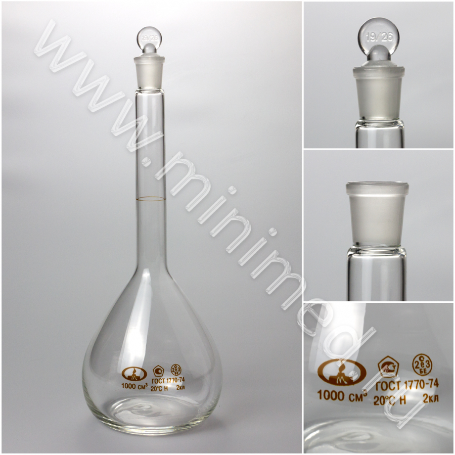 Колба 2-1000-2 мерная, с пришлифованной пробкой 19/26, ТУ 9464-013-52876351-2014, ГОСТ 1770-74, МиниМедПром, уп.2 / кор.24 шт,