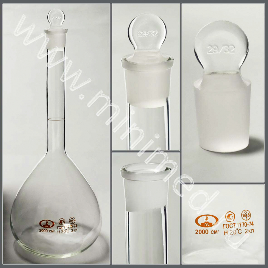 Колба 2-2000-2 мерная, с пришлифованной пробкой 29/32, ТУ 9464-013-52876351-2014, ГОСТ 1770-74, уп.2/12 шт, МиниМедПром