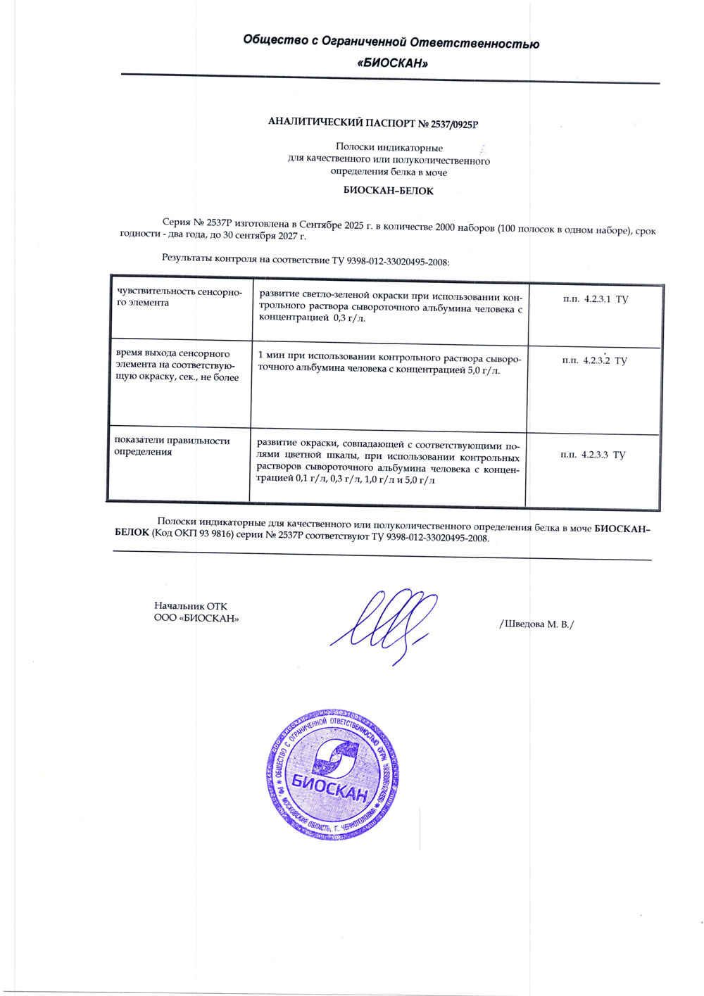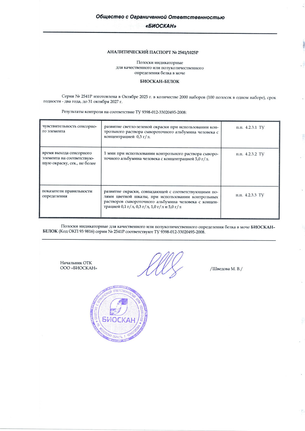 - Полоски индикаторные БИОСКАН-БЕЛОК, с. № 2537Р от 09.2025