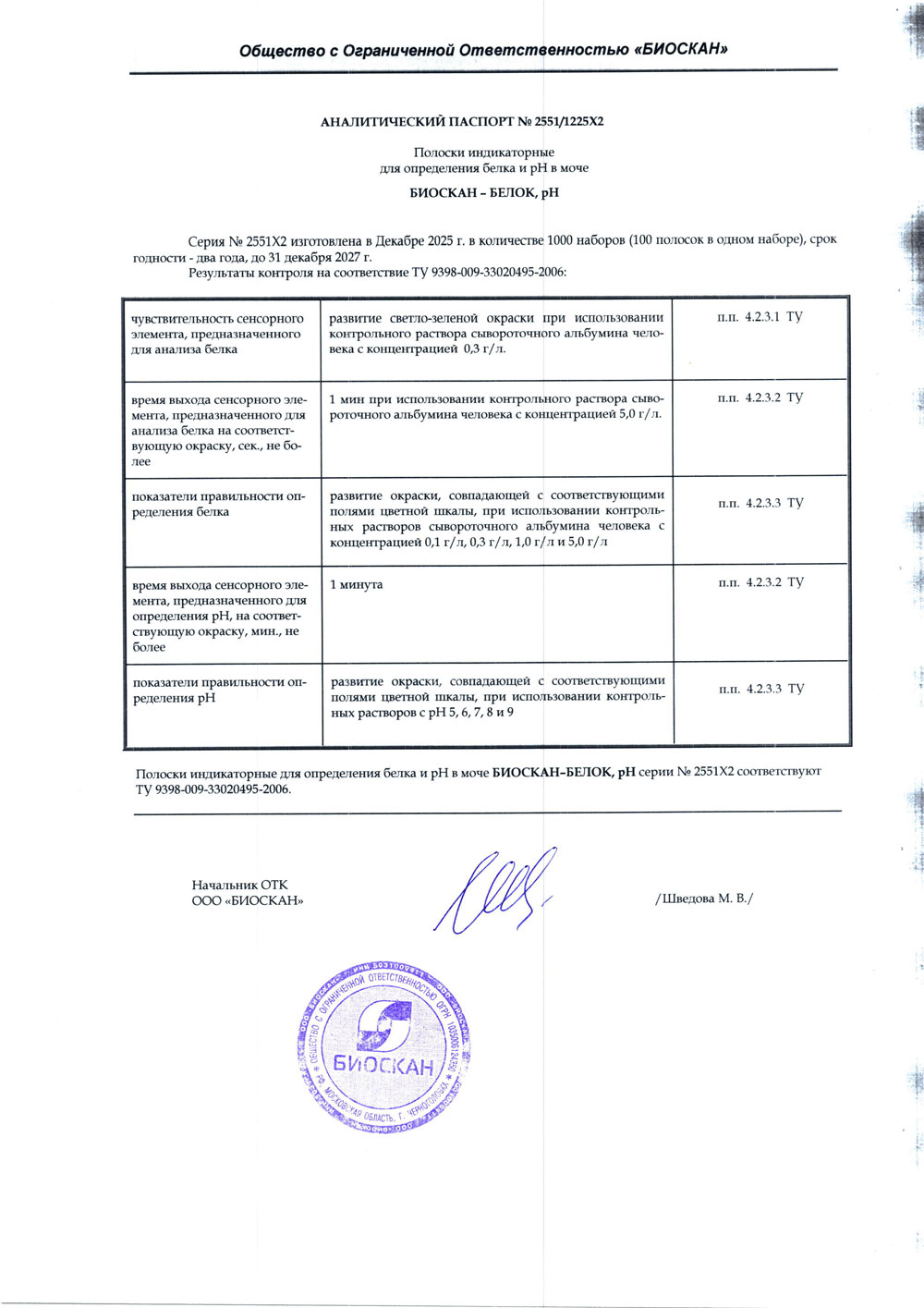 - Полоски индикаторные БИОСКАН-БЕЛОК, рН, с. № 2546Х2 от 11.2025