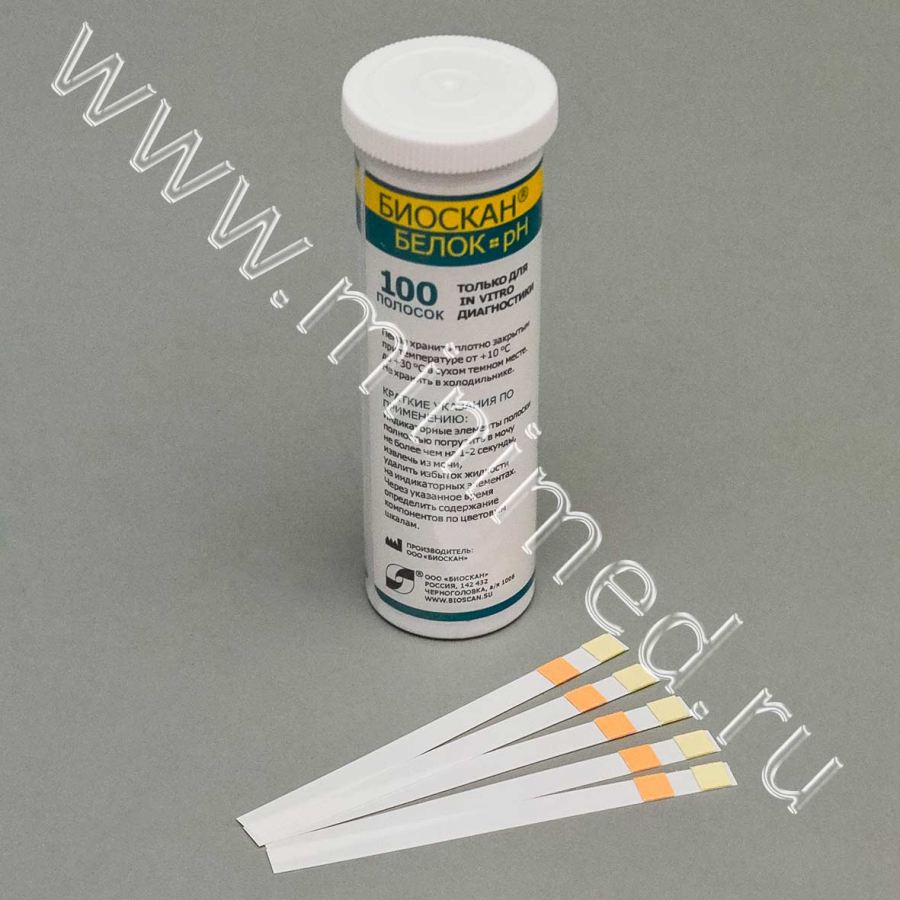 Полоски предназначены для экспресс-анализа содержания белка (альбумина) и уровня кислотности (рН) в моче человека. Индикаторный элемент полосок БИОСКАН-Белок содержит кислый буфер и специфический индикатор, который в присутствии белка изменяет цвет от желтого до зеленовато-синего. Индикаторный элемент на белок высокочувствителен к альбумину и гораздо менее чувствителен к другим белкам — глобулинам, пептонам, мукопротеинам, белкам Бенс-Джонса. Это означает, что отрицательный результат анализа не исключает наличия этих белков. Индикаторный элемент, предназначенный для анализа рН, содержит композицию из двух индикаторов, которая окрашивает элемент от оранжевого до синего цвета в физиологическом диапазоне значений кислотности мочи.Полоски могут быть использованы при массовых обследованиях здоровья населения, при обычных анализах мочи в клиниках и поликлиниках. Полоски могут применяться как медицинским персоналом, так и самими пациентами в порядке самоконтроля.