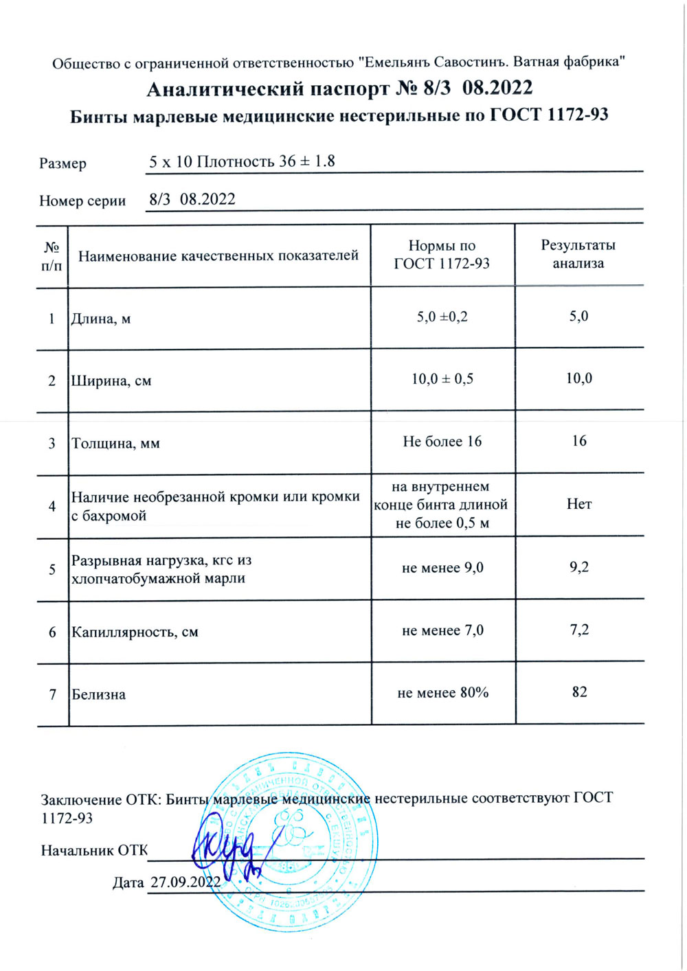 - Бинт марлевый медиц. нестерильный 5х10, п. 8-3 от 08.2022