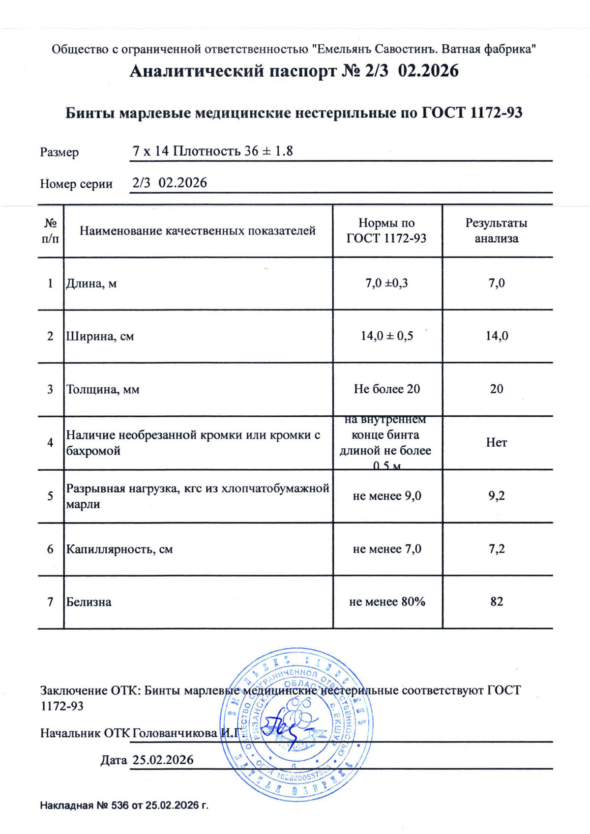 Бинт марлевый медицинский 7*14 нестерильный, инд.уп., плотность 36г/кв.м. ГОСТ 1172-93